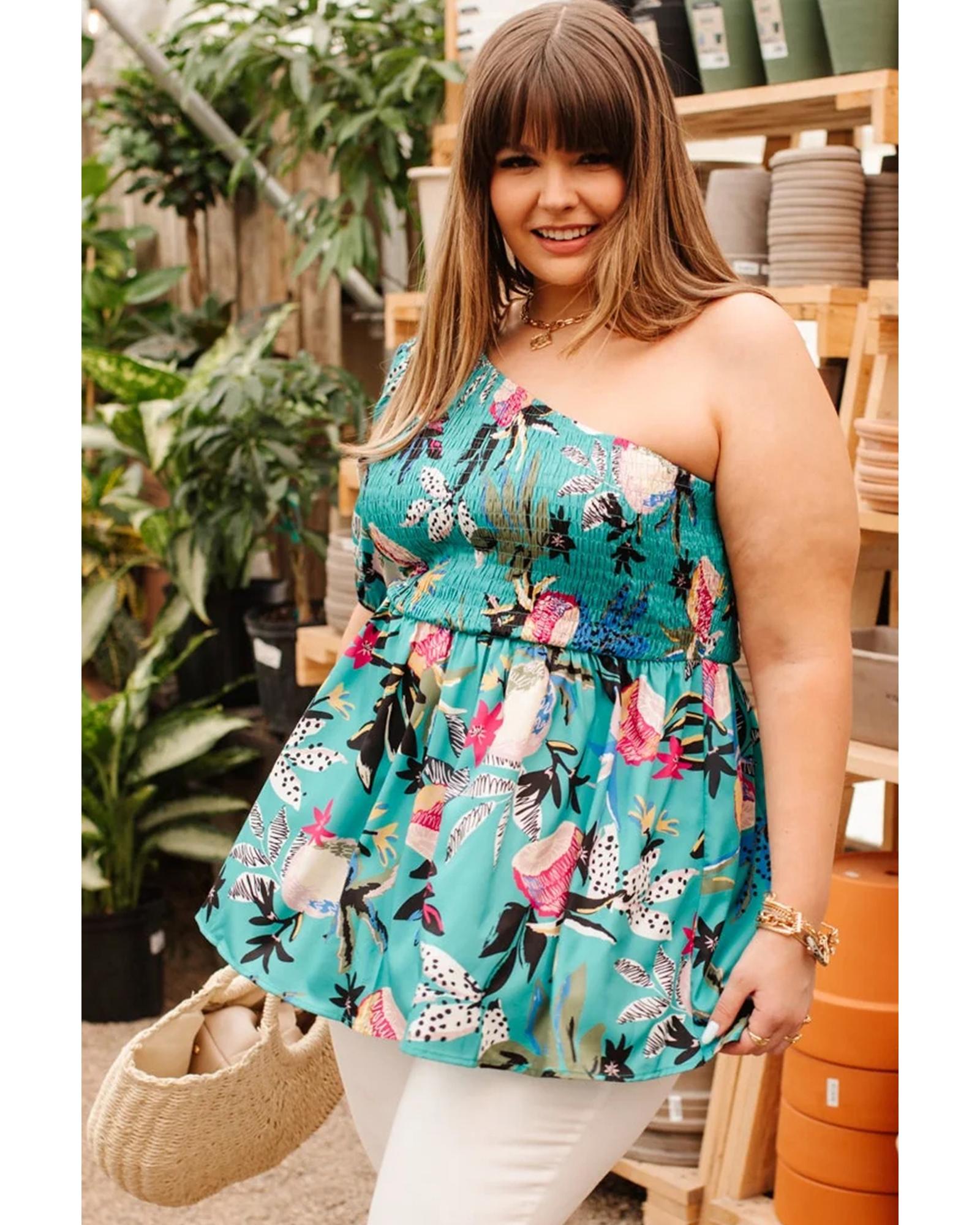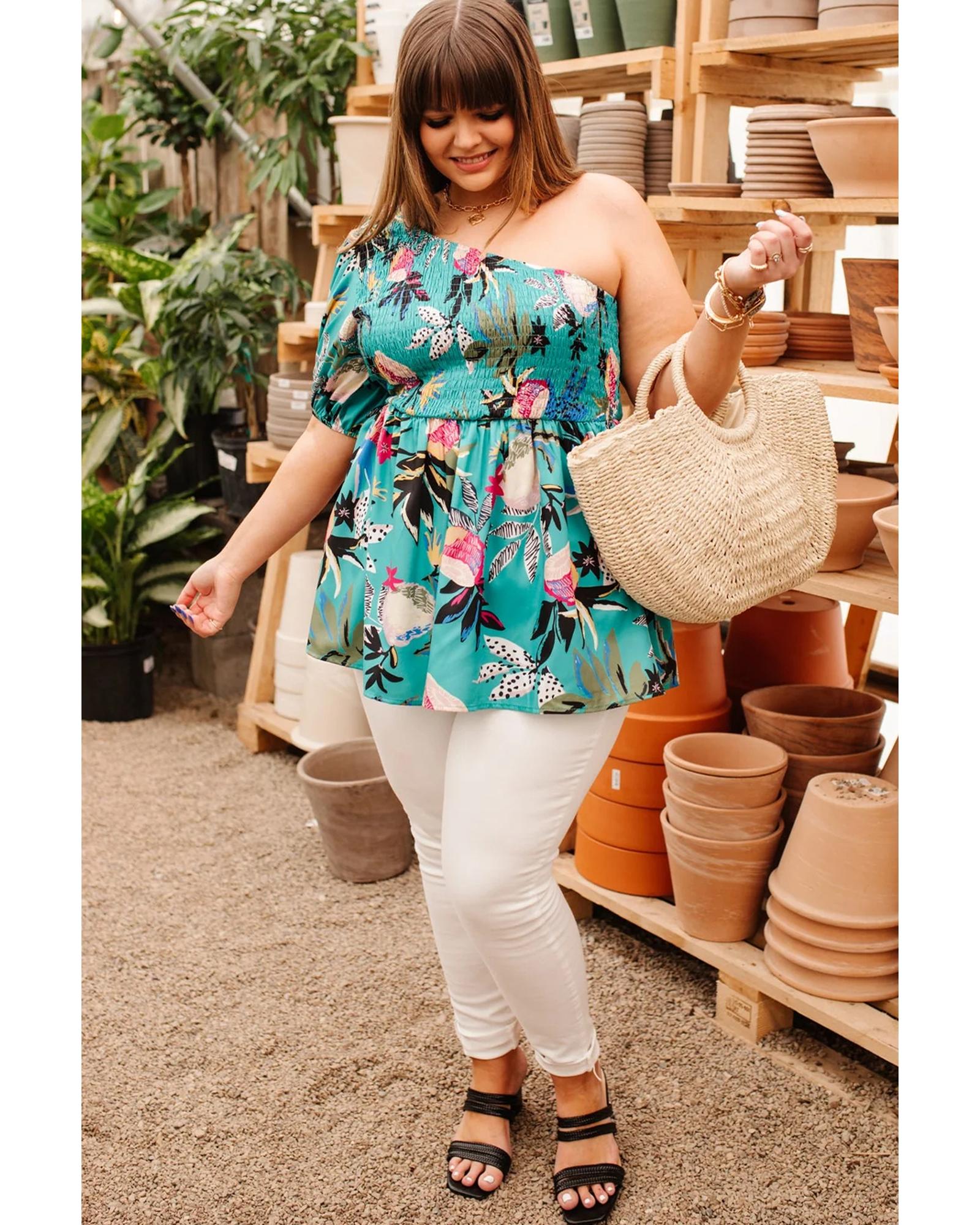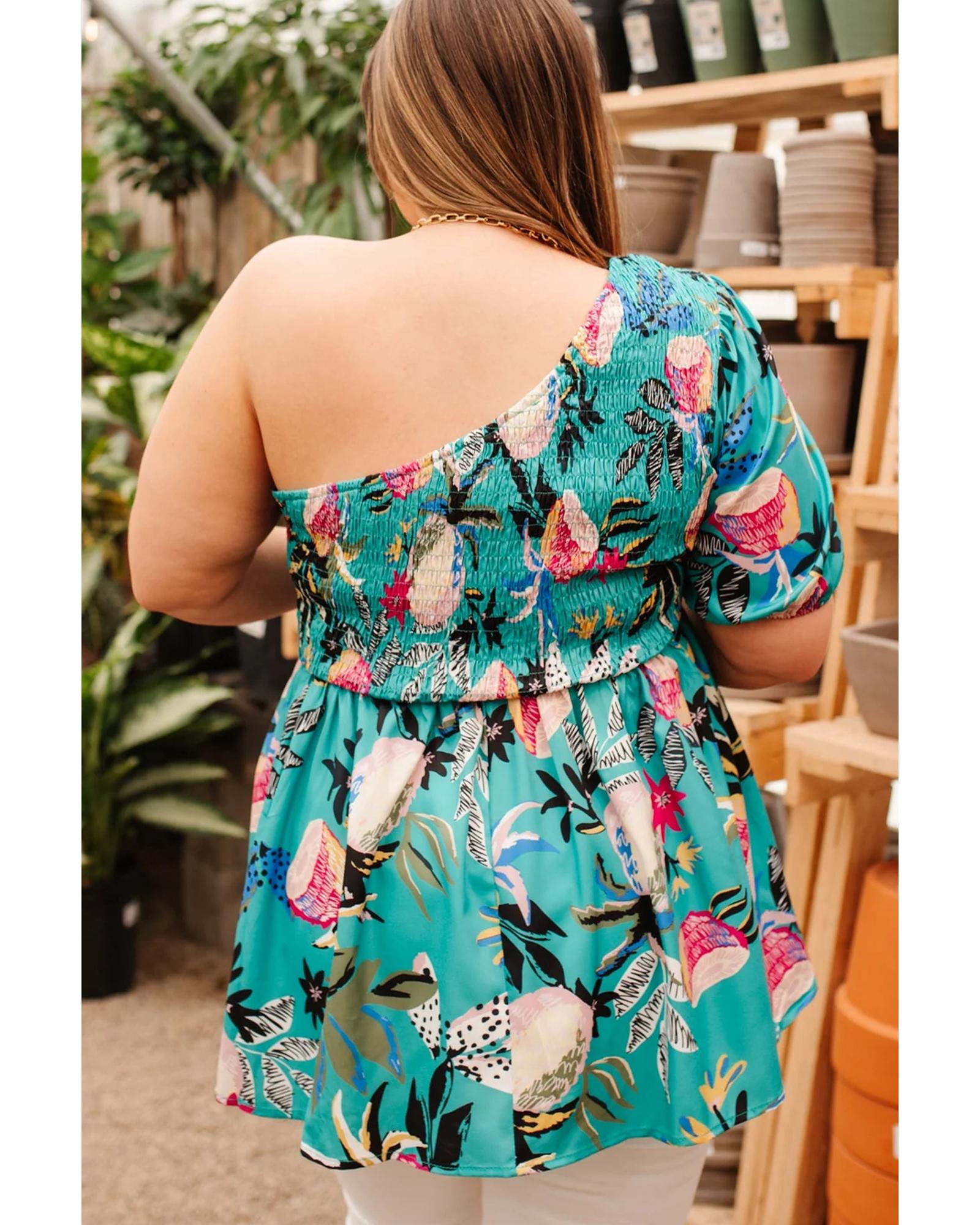 Green Plus Size Floral Smocked Bodice Single Puff Short Sleeve Babydoll Blouse – 2X