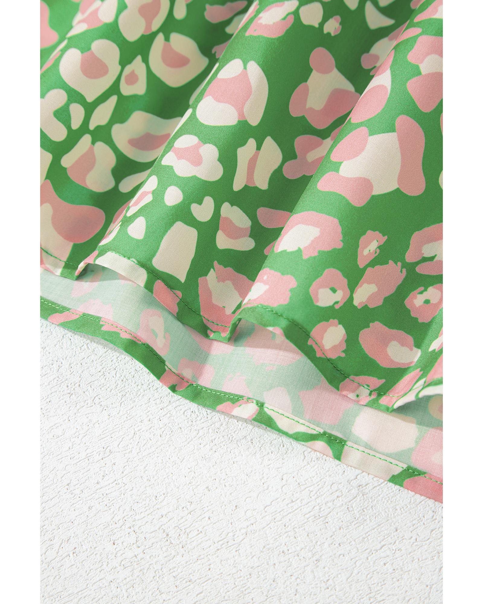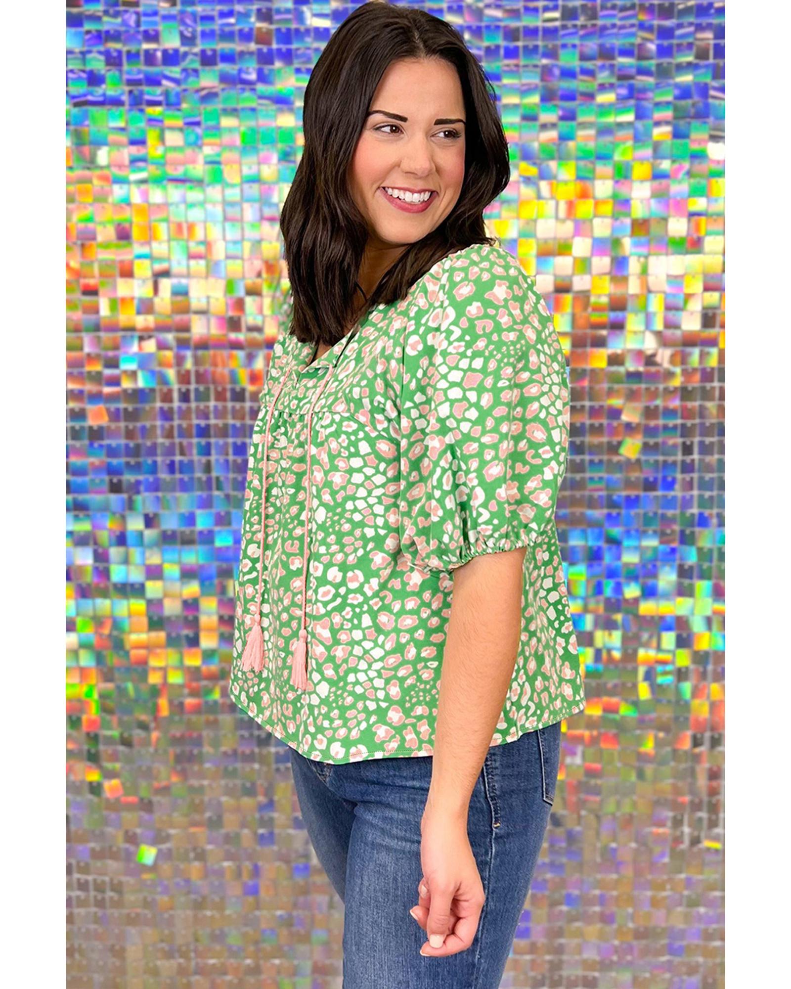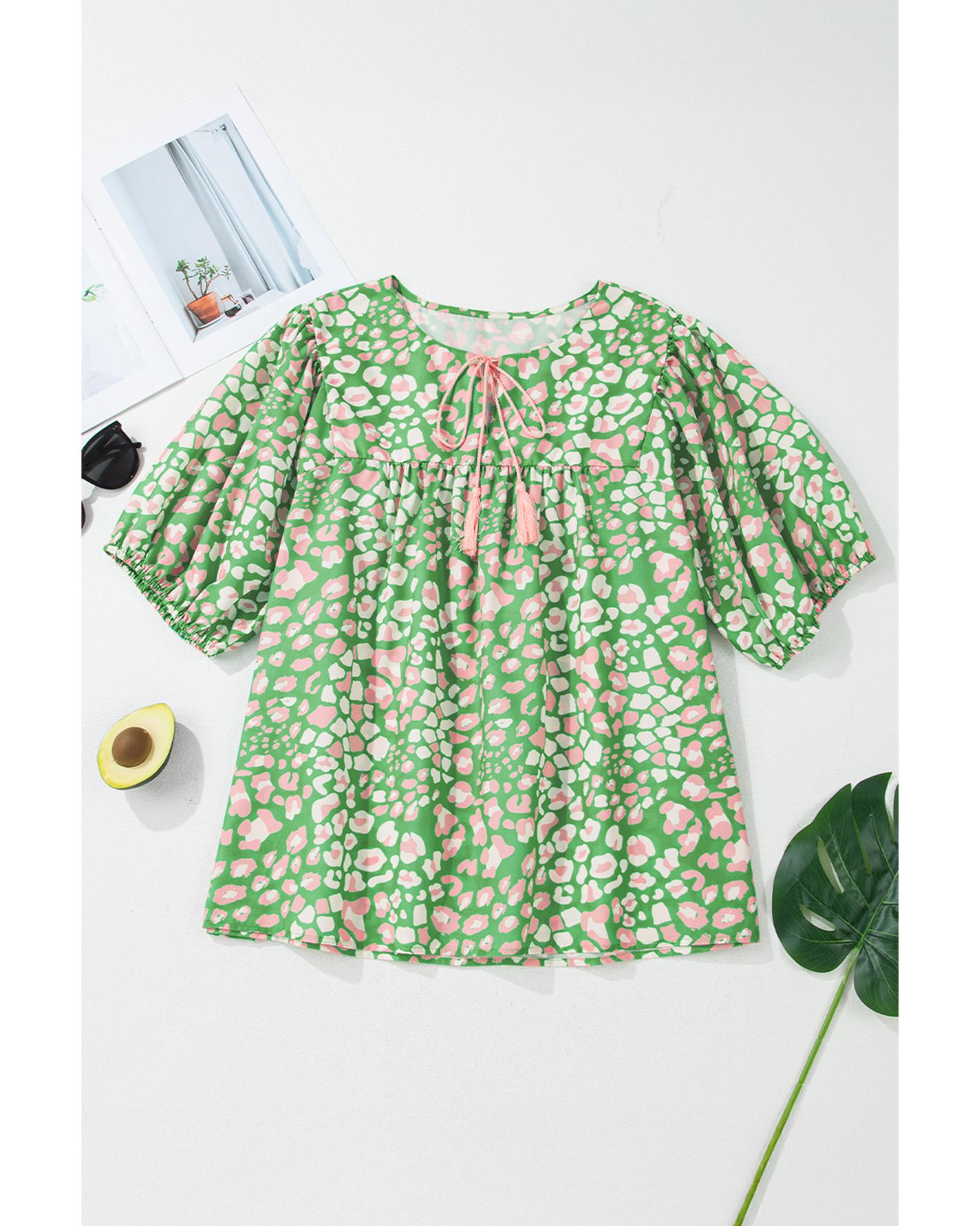 Green Plus Size Floral Tassel Tie Split Neck Puff Sleeve Blouse – 4X