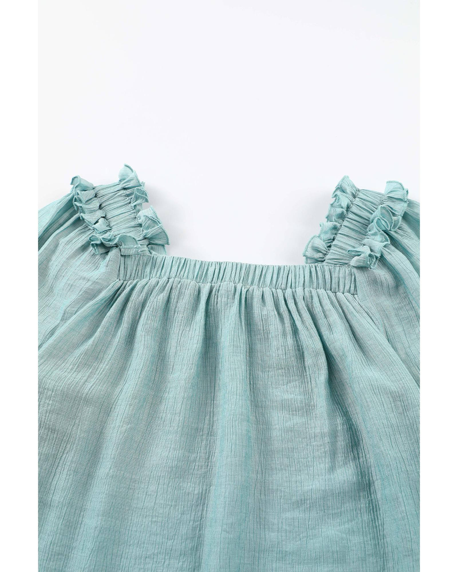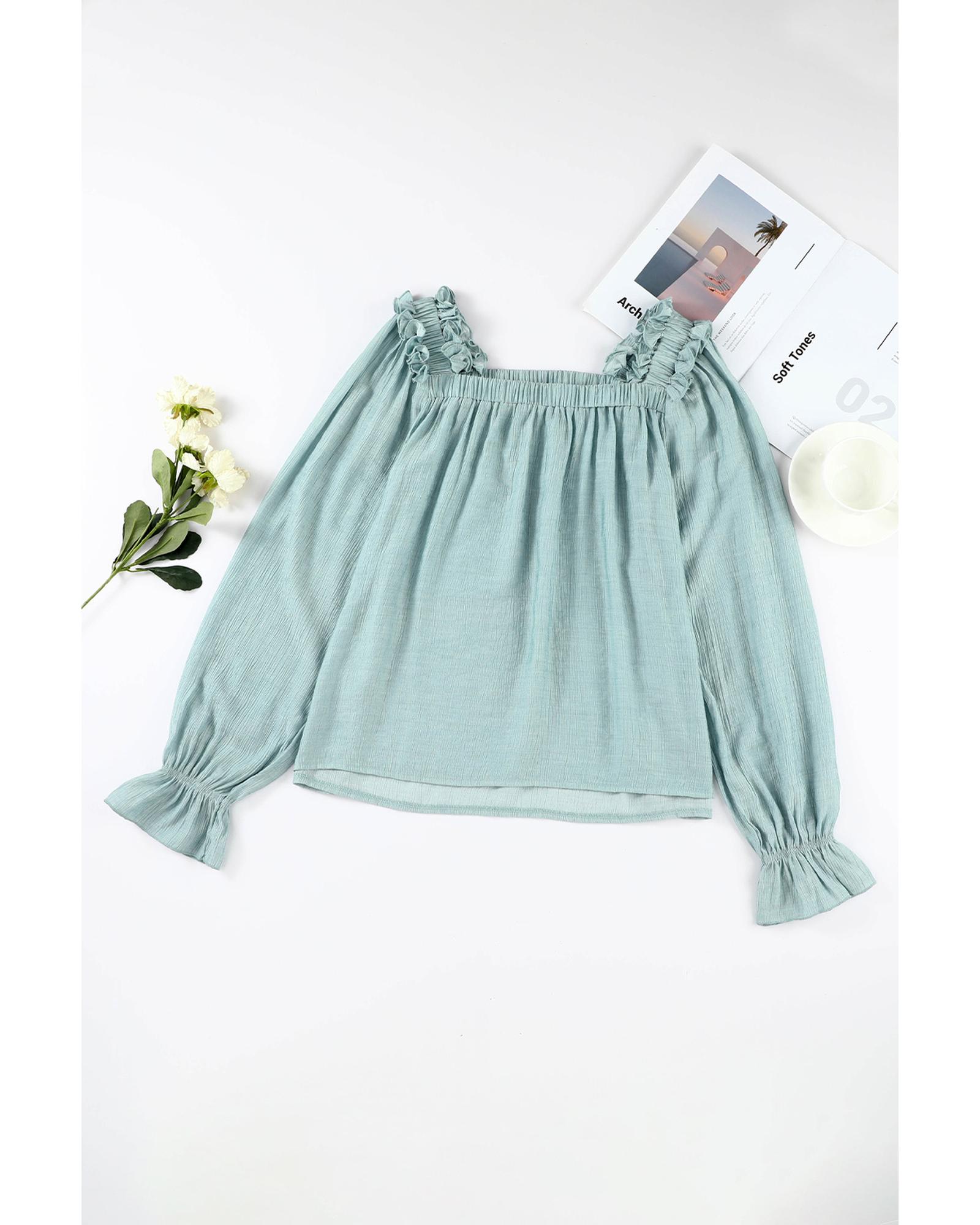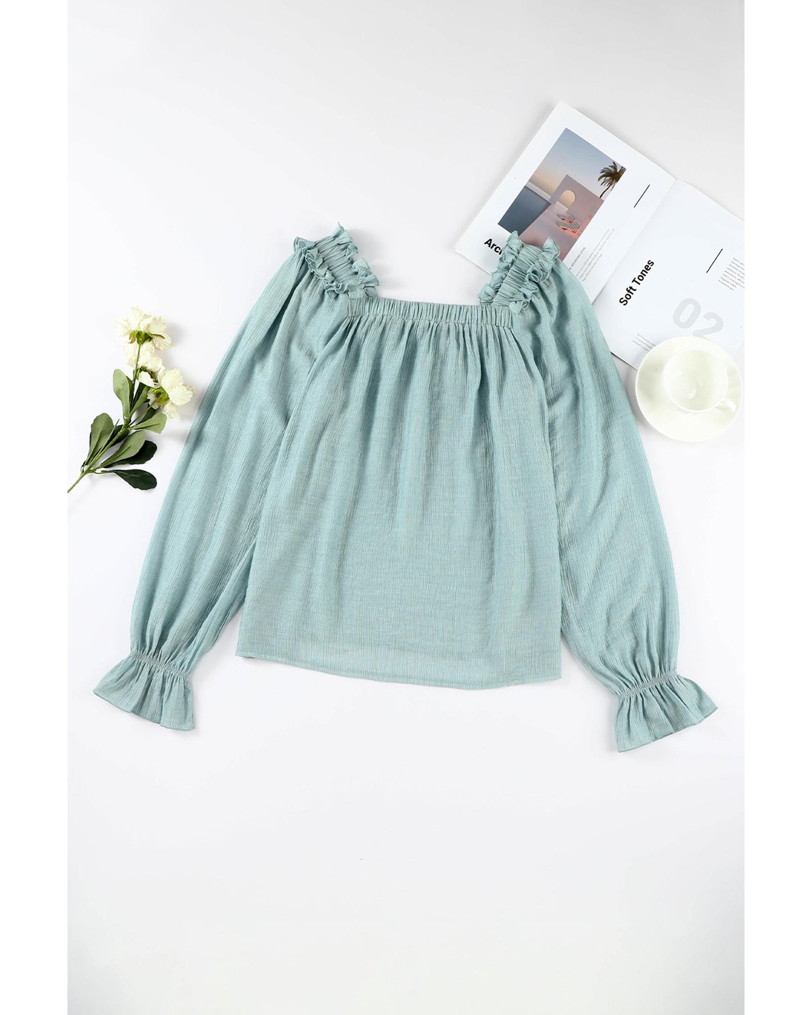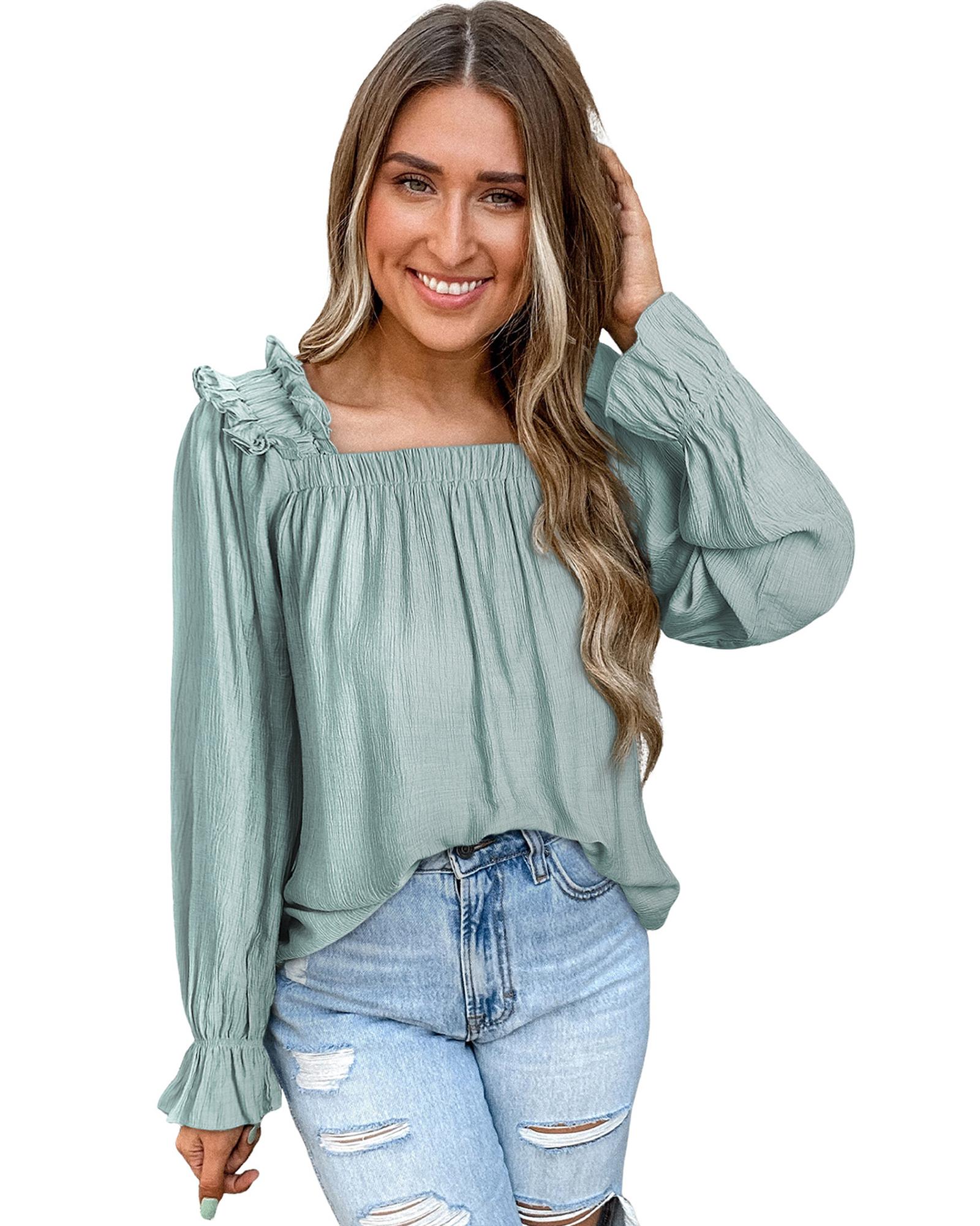 Green Ruffled Square Neck Cuffs Long Sleeve Blouse – XL