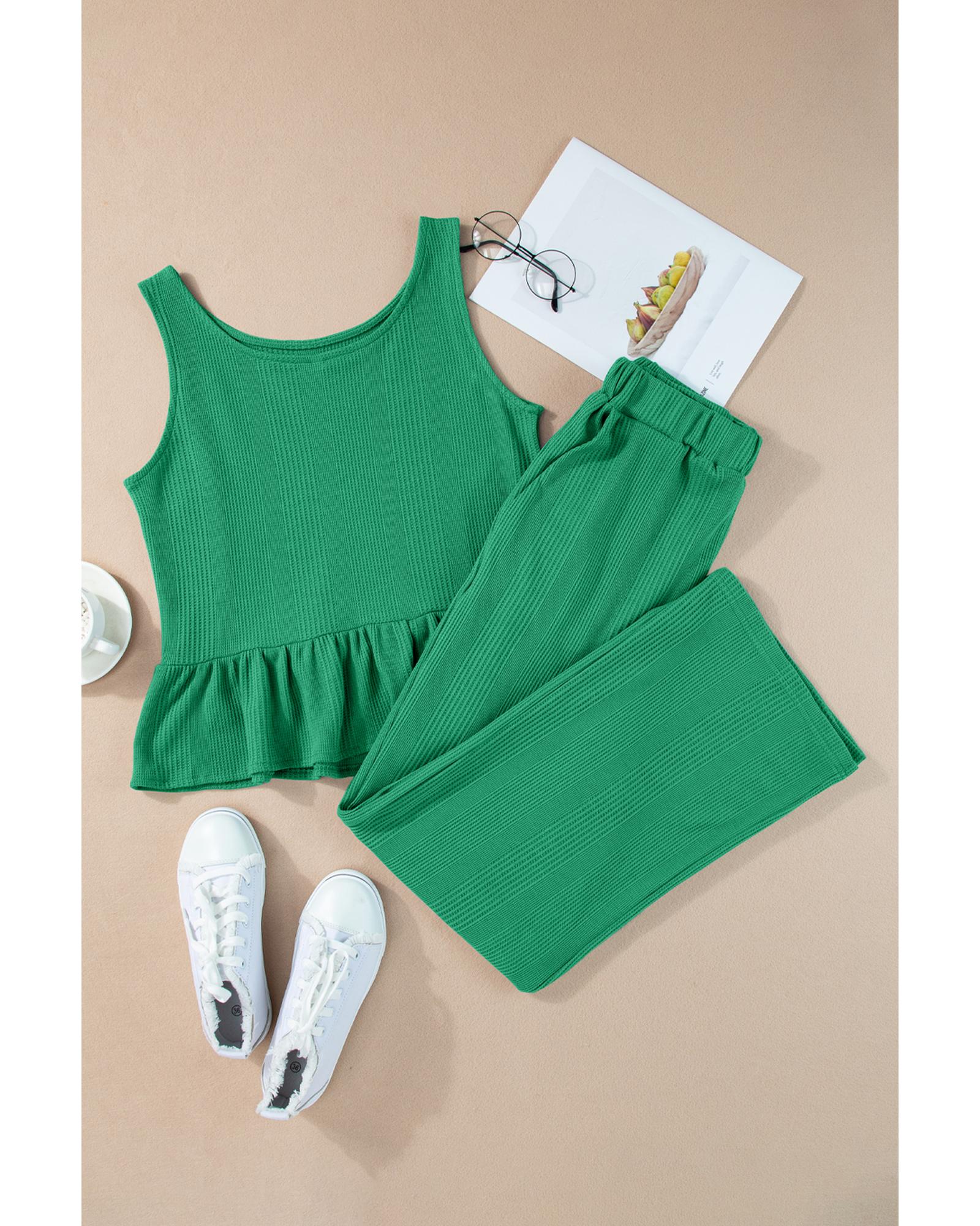 Green Solid Color Ribbed Ruffle Tank Top and Pants Set – M