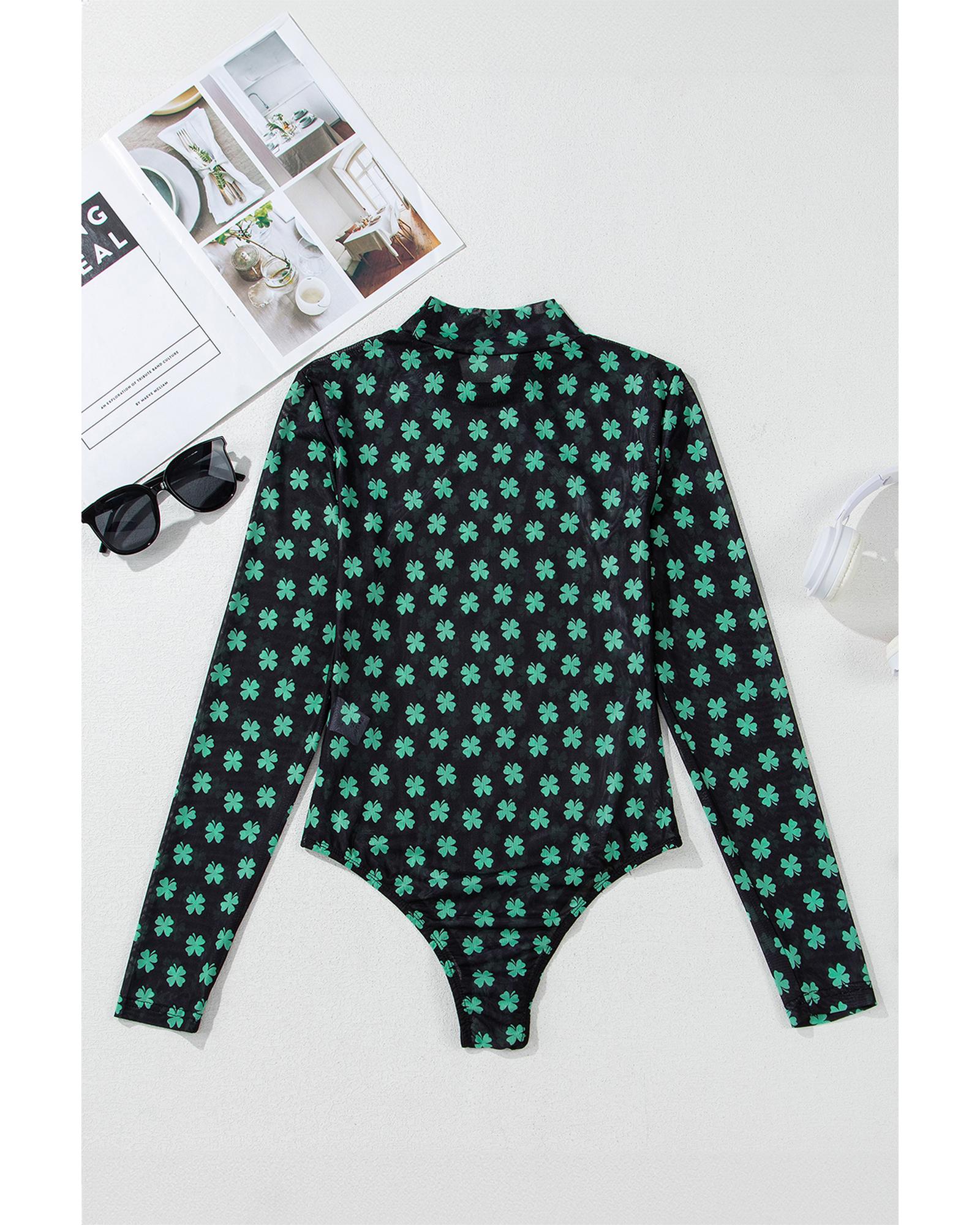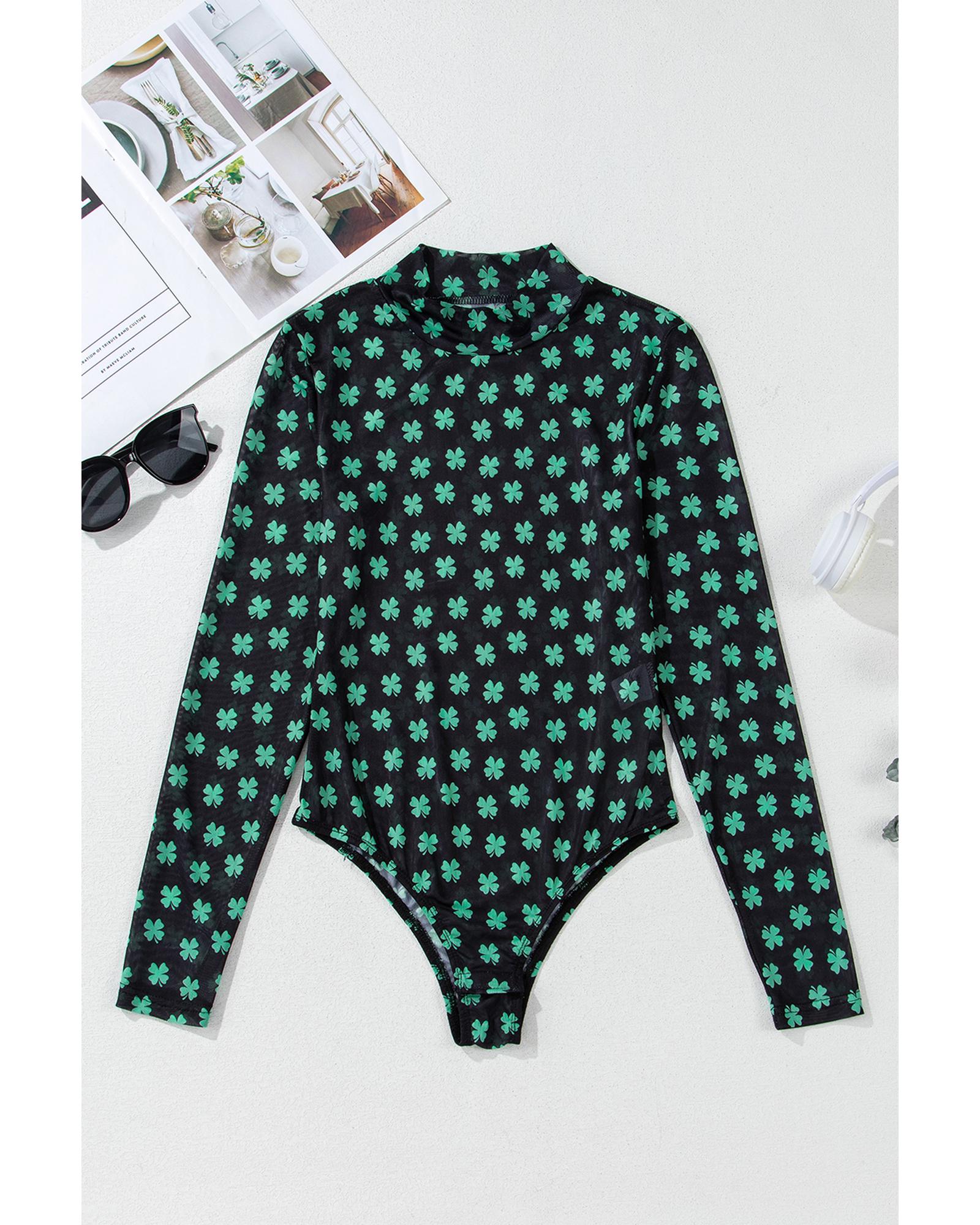 Green St Patrick Shamrock Printed Long Sleeve Mesh Bodysuit – L