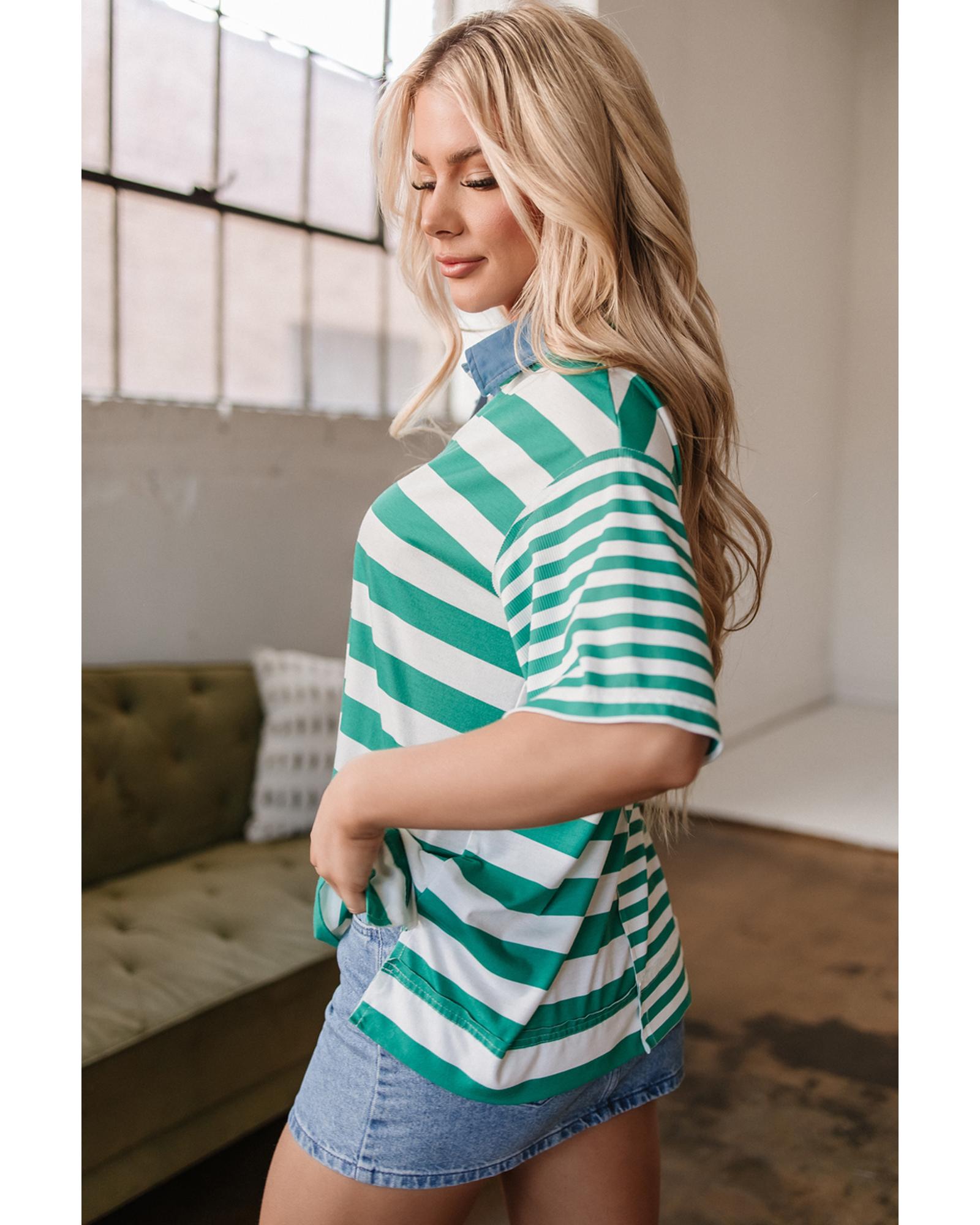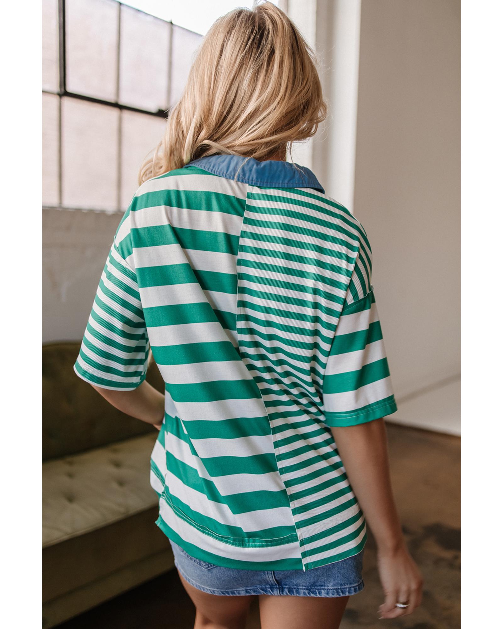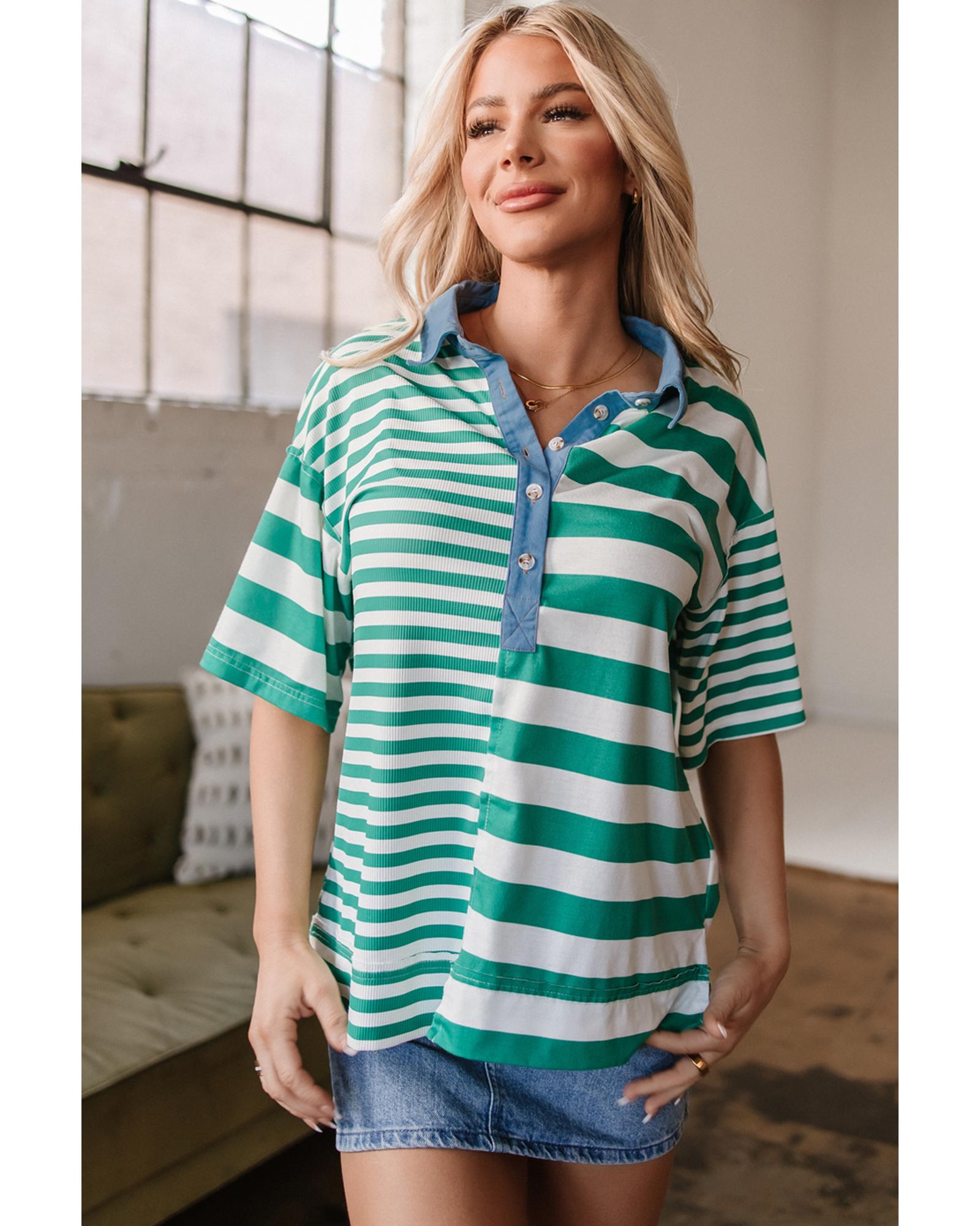 Green Stripe Colorblock Collar Half Buttons T Shirt – L