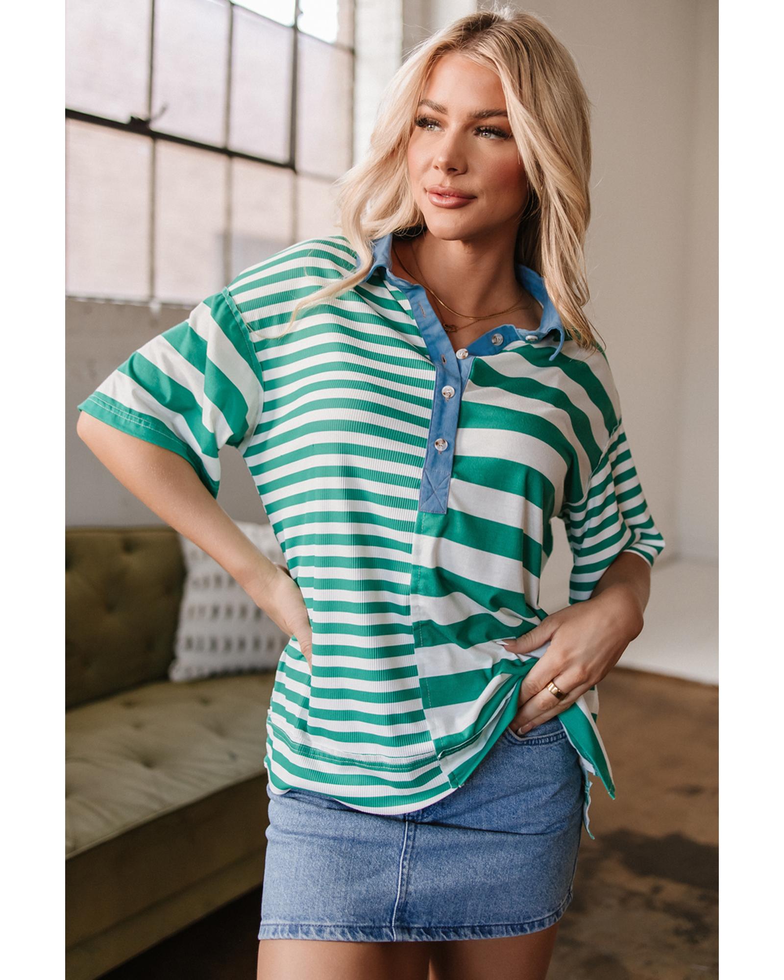 Green Stripe Colorblock Collar Half Buttons T Shirt – M