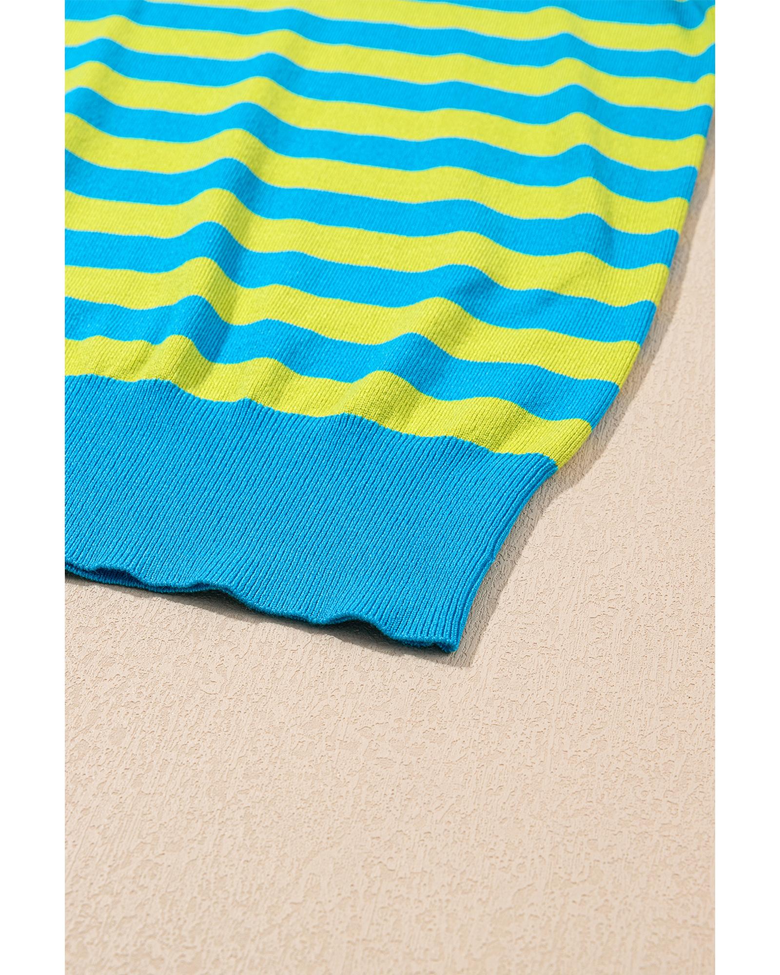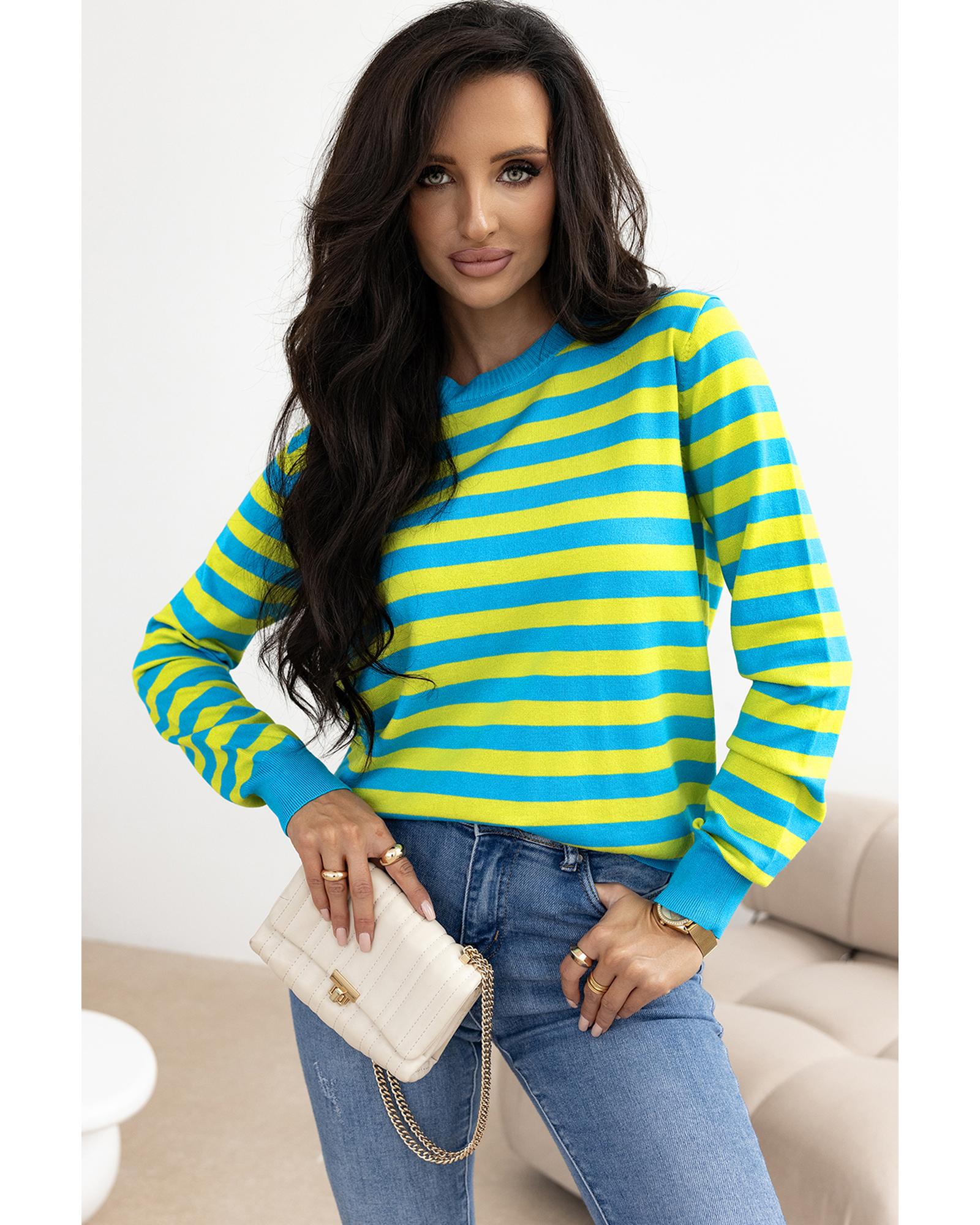 Green Stripe Crew Neck Drop Shoulder Casual Sweater – L