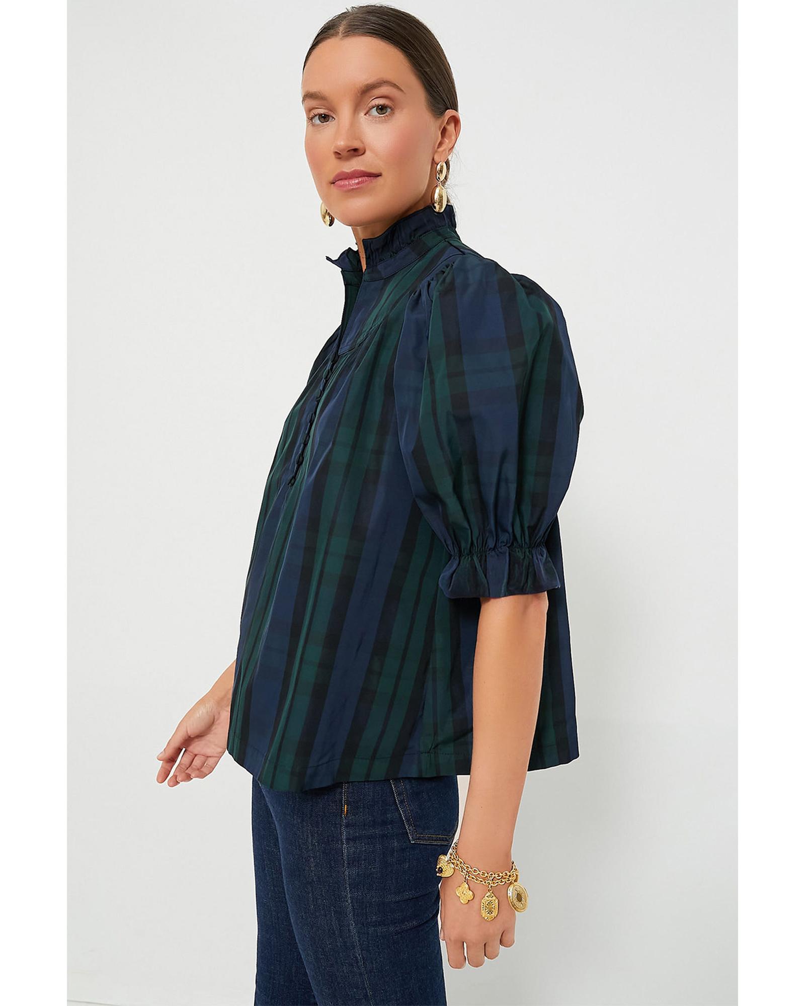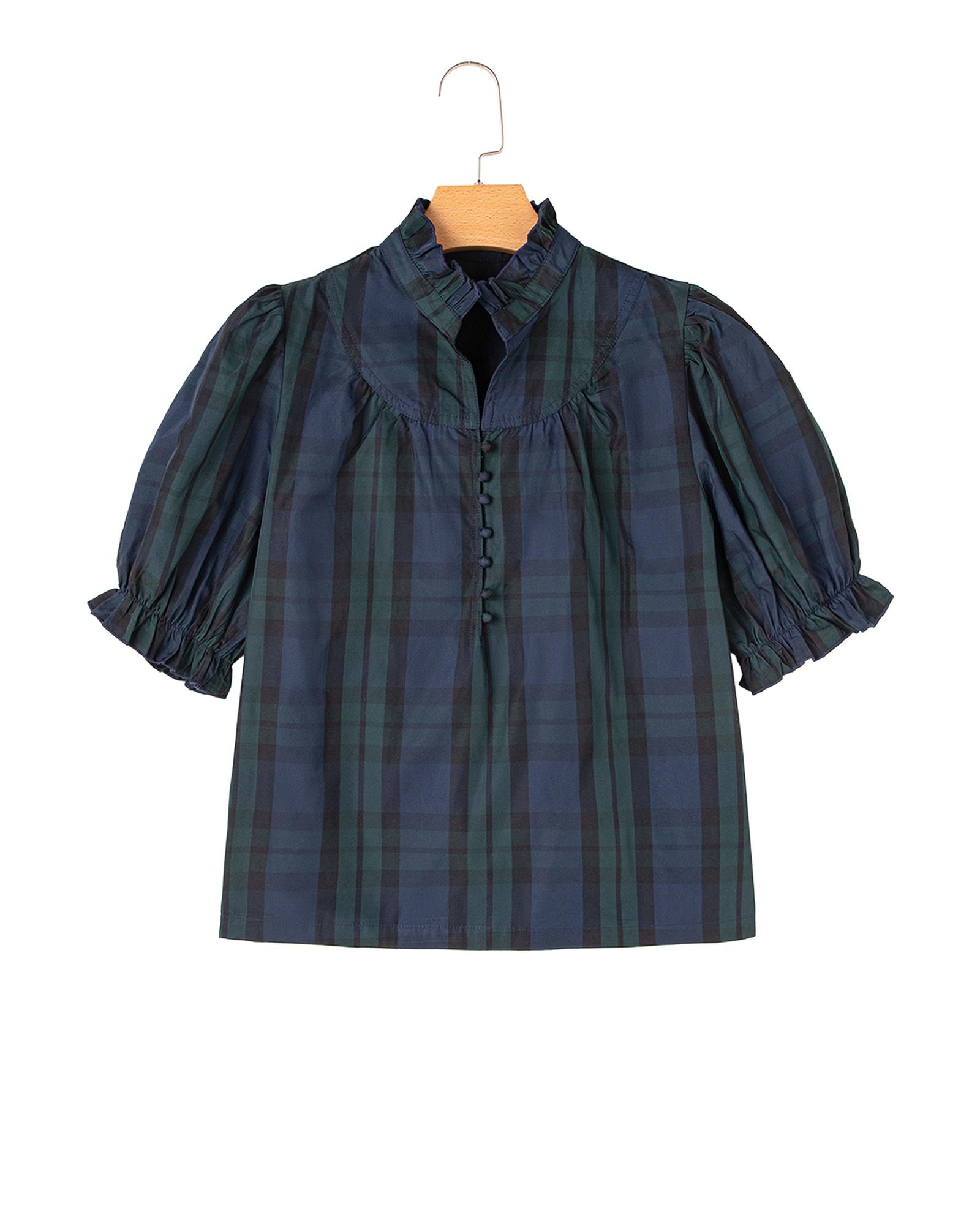 - Green Stripe Plaid Puff Sleeve Frilled Trim Elegant Blouse
