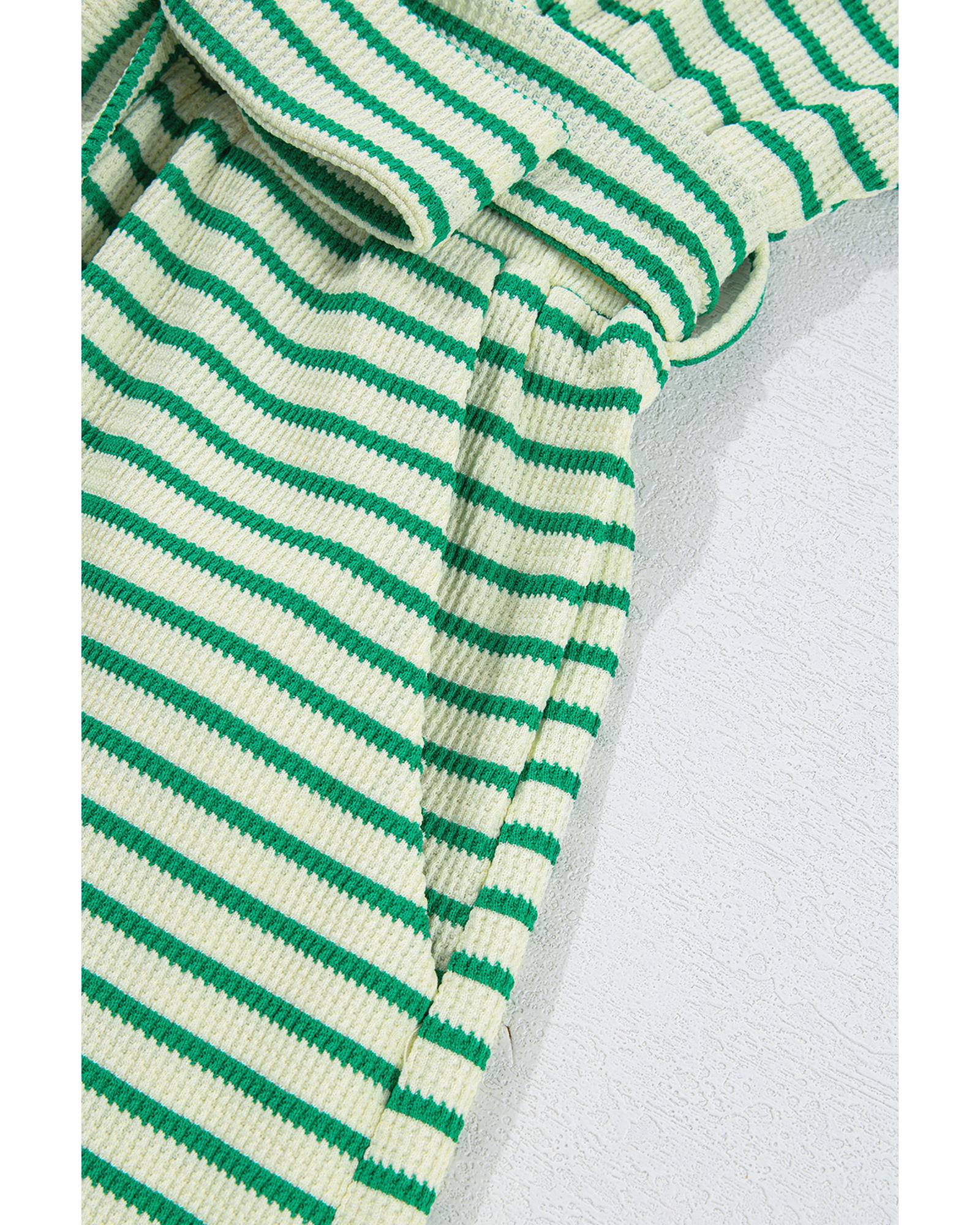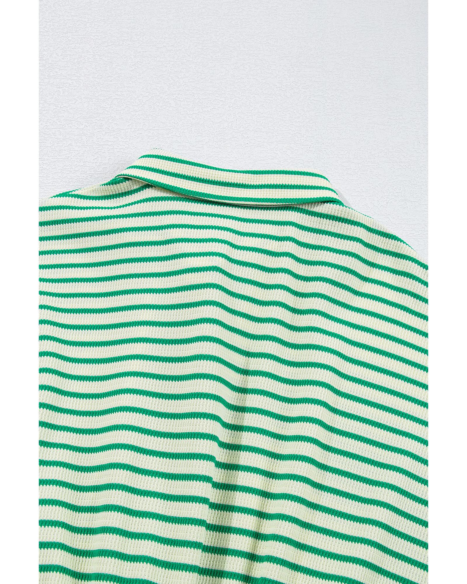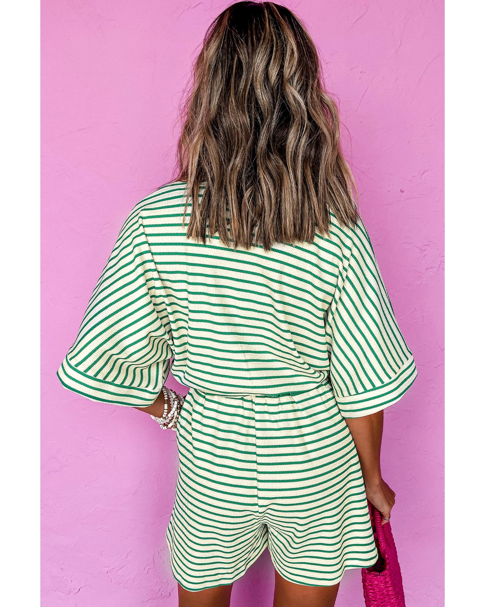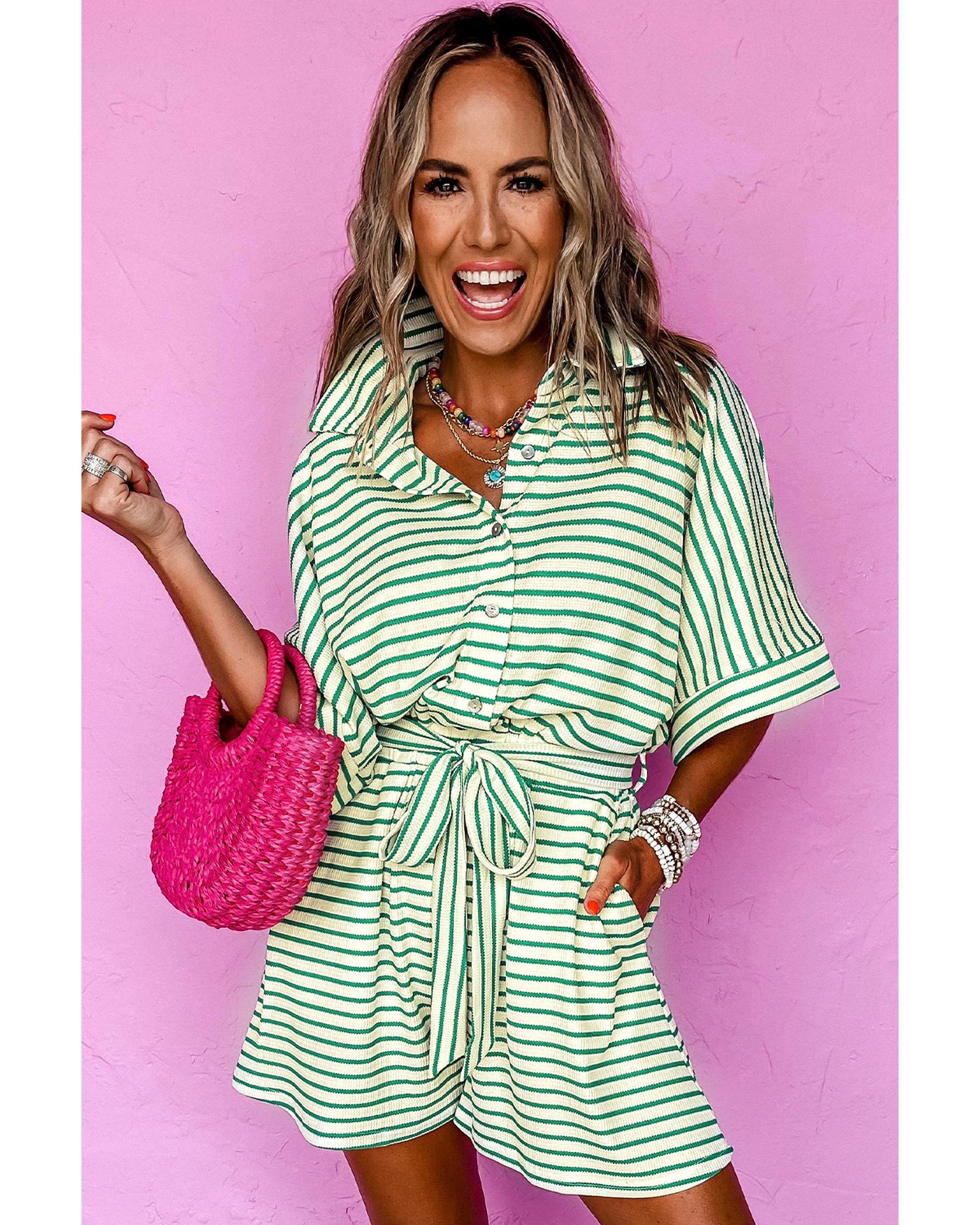 Green Stripe Textured Short Sleeve Collared Buttoned Waist Tie Romper – XL