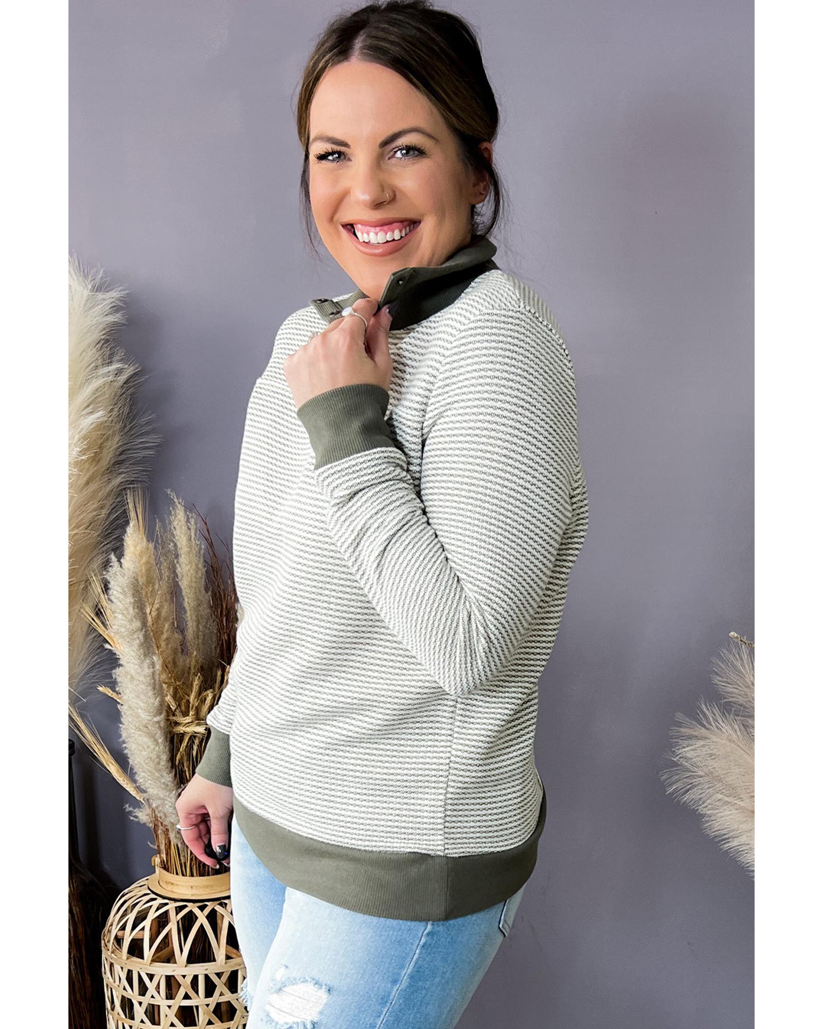 Green Striped Contrasting Trim Plus Size Henley Pullover Exclusively designed for full - figured women Unique striped pattern for a stylish look Snap buttons and contrast trim for added detail Warm and comfy for all