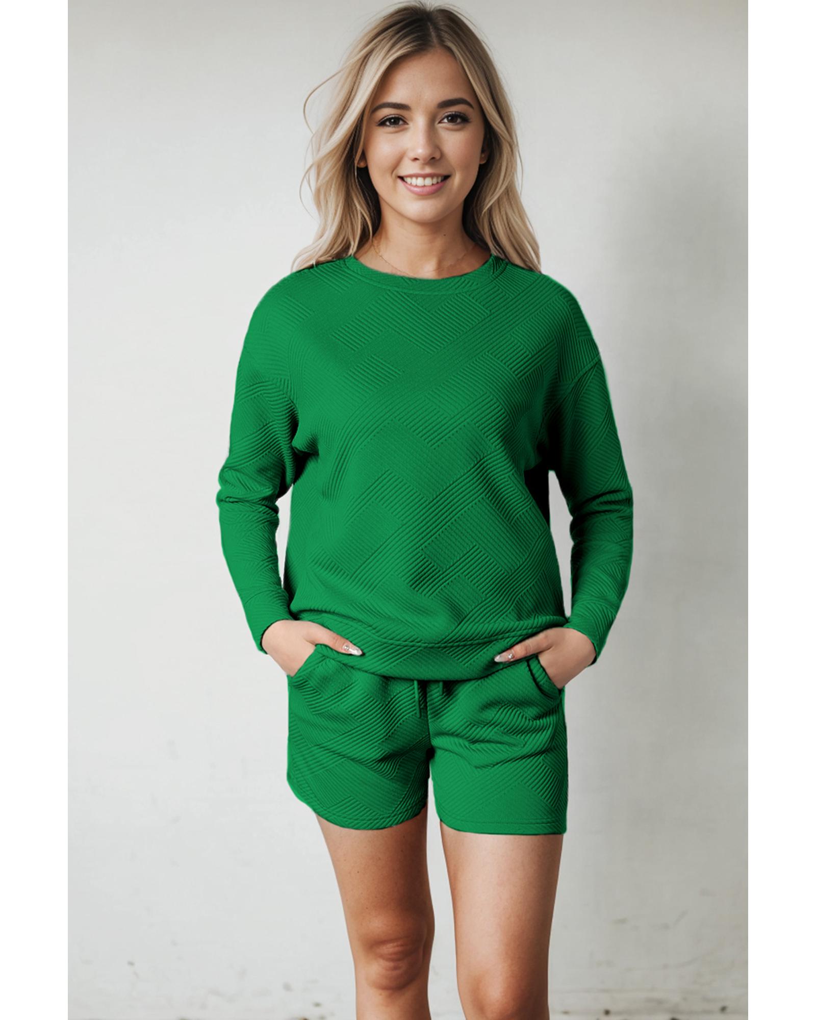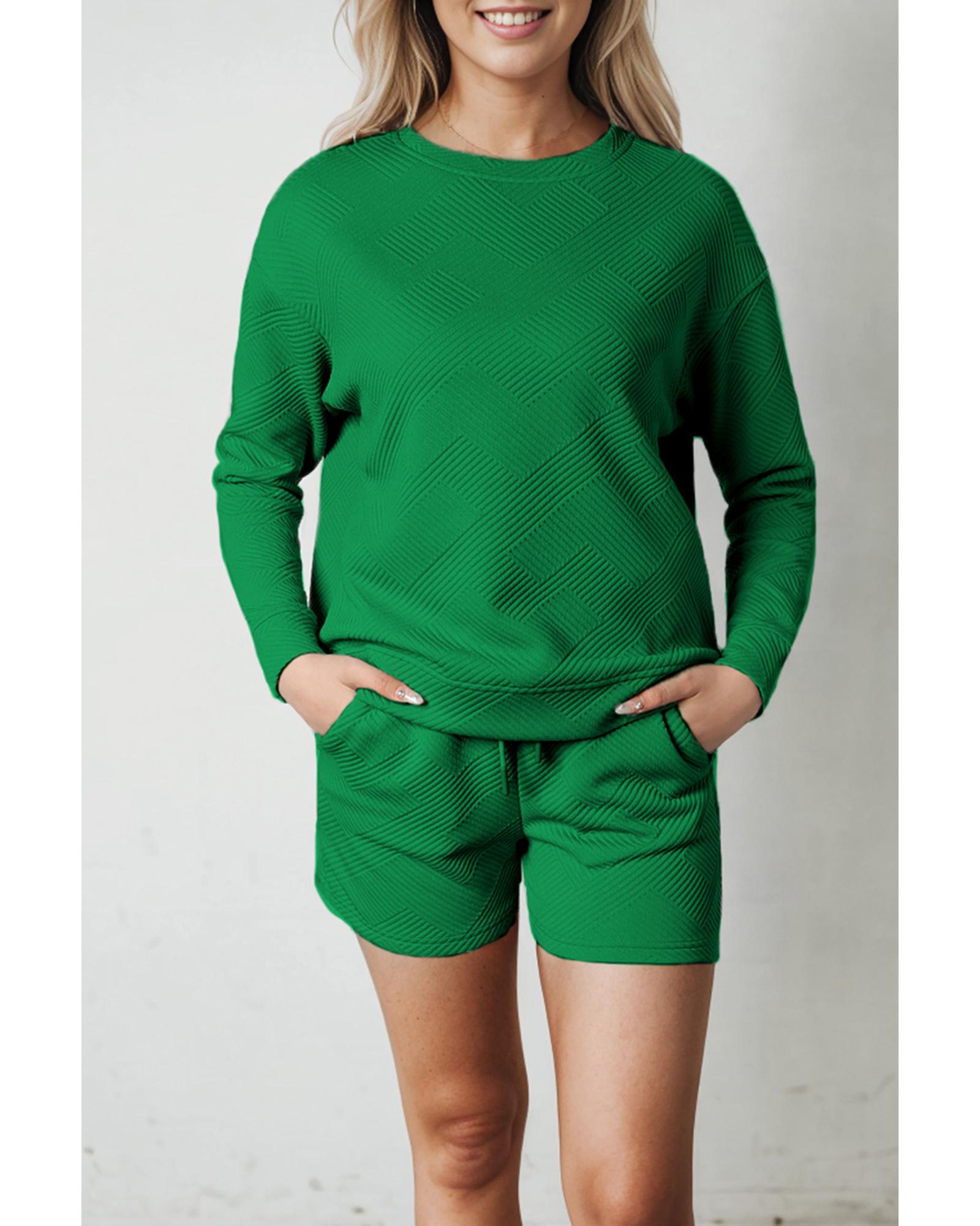 Green Textured Long Sleeve Top and Drawstring Shorts Set – M