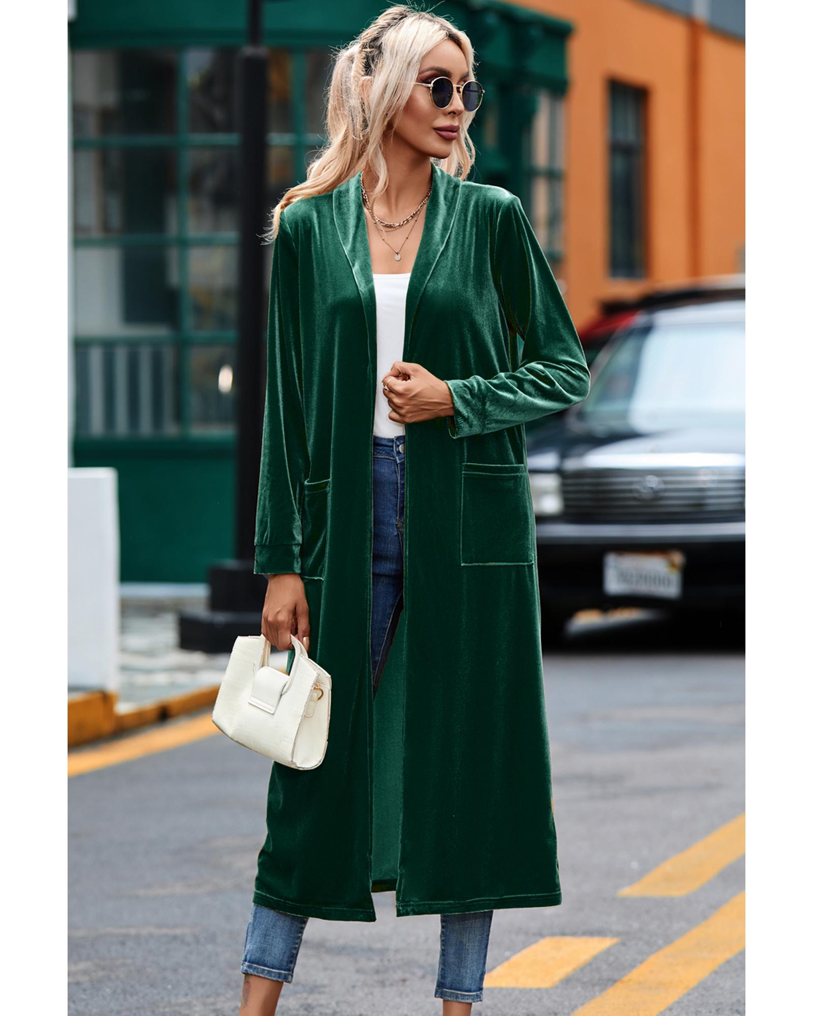Green Velvet Open Front Pocketed Long Duster – L