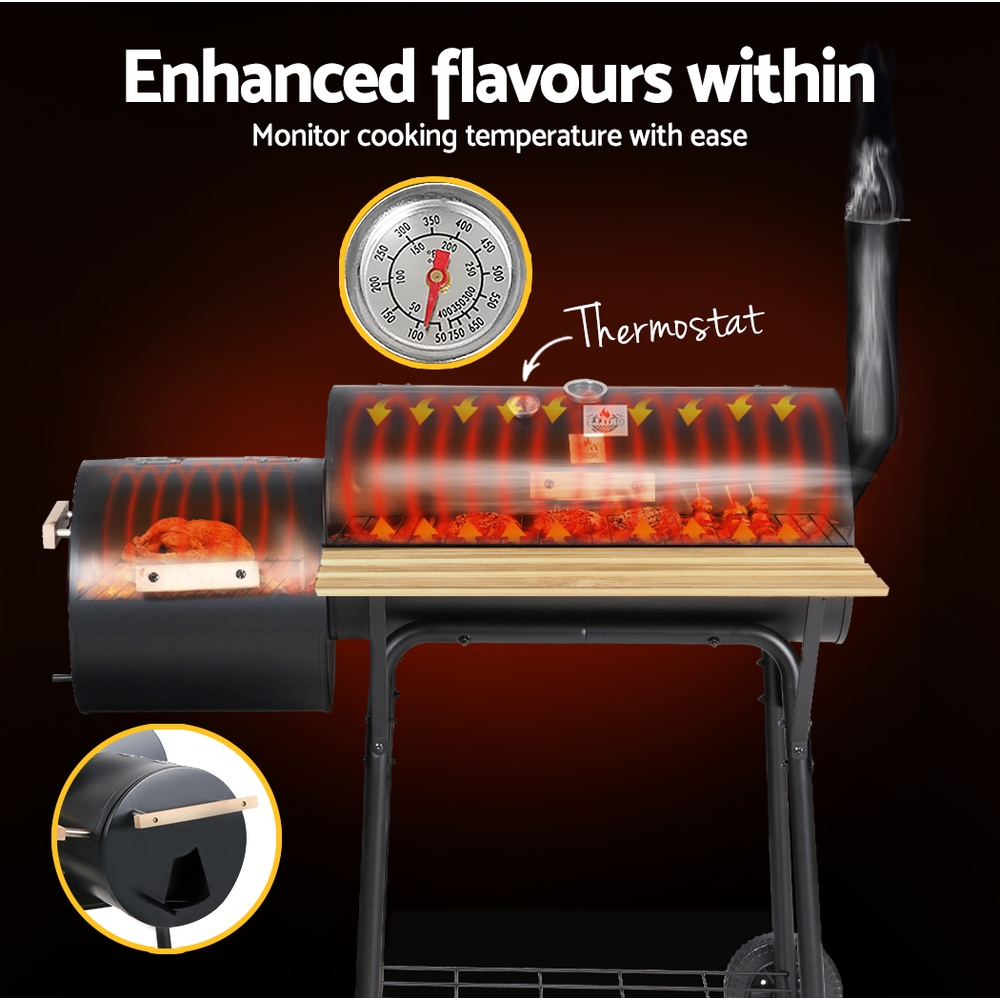 With the wide front shelf, you have plenty of space for all your cooking paraphernalia. Place your spices, ingredients, sauces, utensils and other BBQ essentials there for effortless reach and use during cooking. Not least, the two wheels enables the BBQ Smoker to be easily carted around for outdoor gatherings, parties, picnics or any special event.