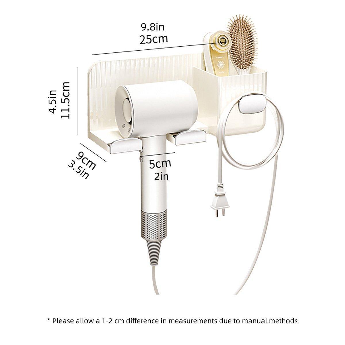 This elegant and functional wall-mounted hair dryer holder offers a sleek solution for organizing your bathroom essentials. Designed with a durable plastic frame and smooth finish, it securely holds your hair dryer and various accessories while keeping your space tidy. The holder includes an additional compartment for brushes or other tools, and a hook for cables, making it a versatile addition to any bathroom or vanity area.