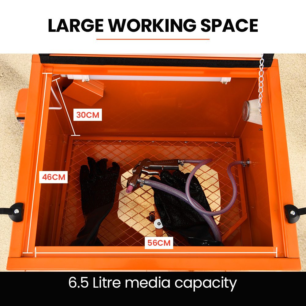 Say goodbye to wasted sand. The fully enclosed design recycles and collects your blasting medium, maximizing its use. It has a generous 90-litre volume and 6.5L media capacity; it effortlessly handles rusty tools, engine parts, old rims and even brass antiques by selecting the right blasting medium.