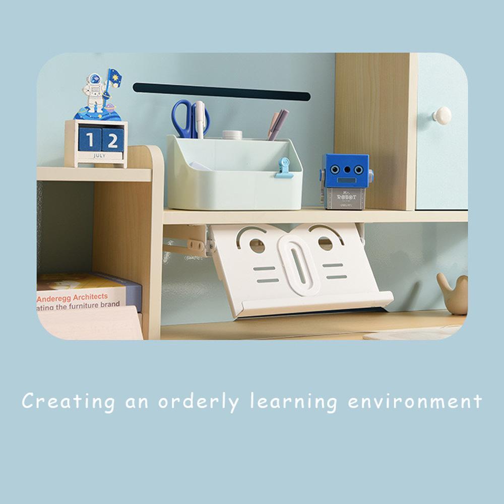 - Whole set includes desk, shelf, detachable book/tablet stand, chair