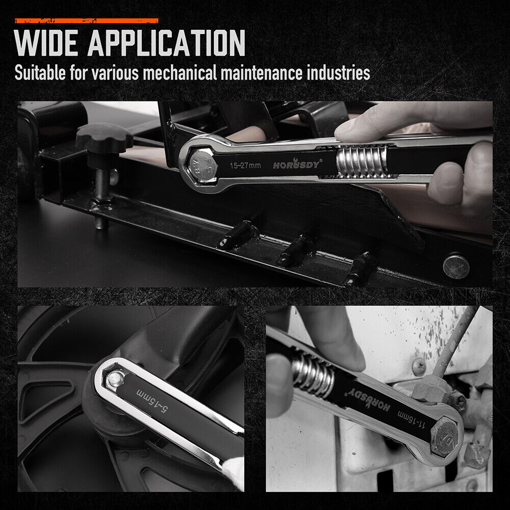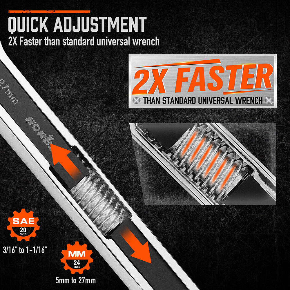 Different sizes meet your different needs. The 8-inch universal wrench fits both standard 3/16 ” to 5/8 ” and metric 5mm to 16mm nuts and bolts; 10-inch universal wrench fits both standard 11/16 ” to 1-1/16 ” and metric 17mm to 27mm nuts and bolts, adjust the size by moving the middle push block.