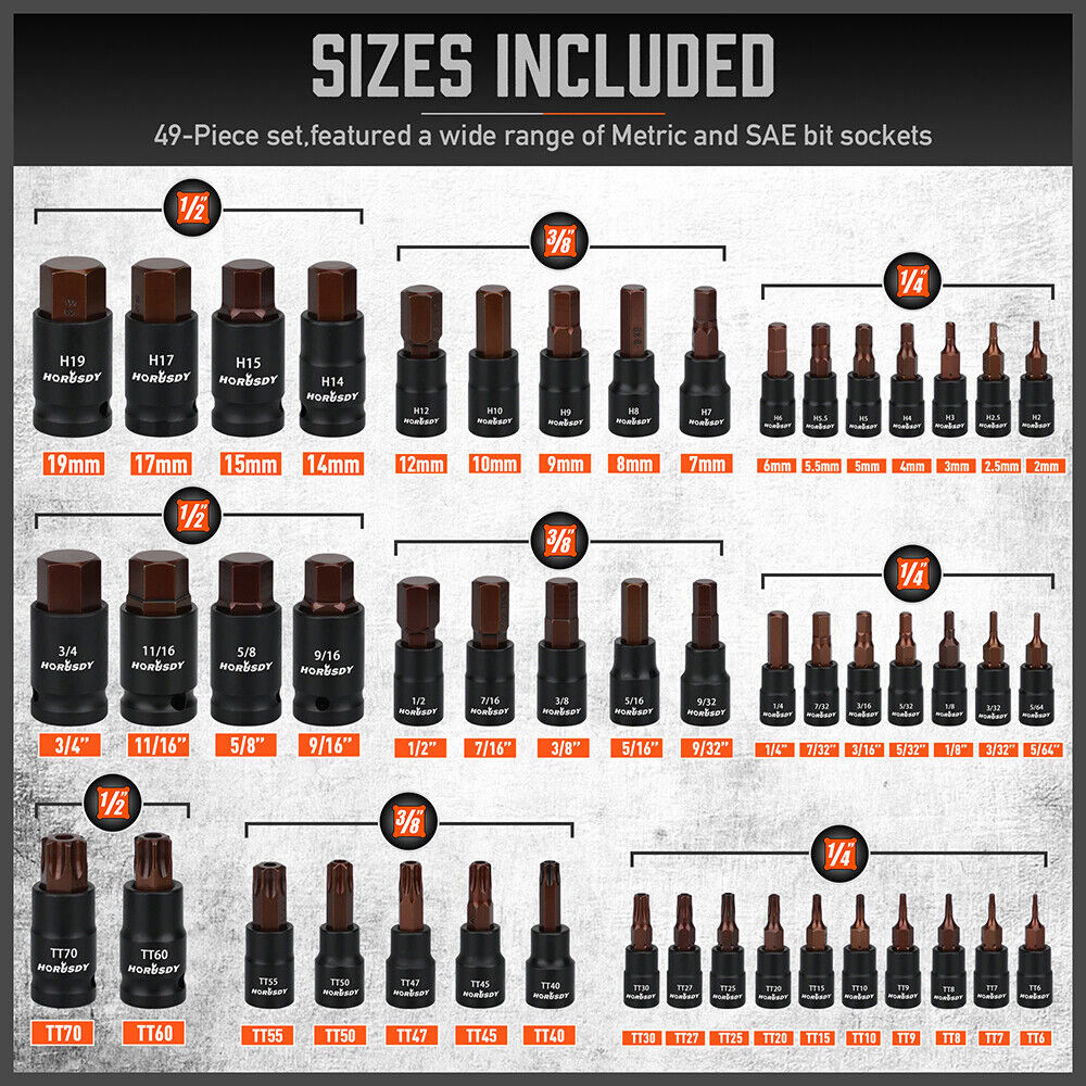 COMPLETE KIT– This comprehensive set includes T6-T70 star bits, E4-E24 E-Torx, and both metric and SAE hex socket bits, providing the perfect tools for any task, whether using a driver, wrench, or ratchet.