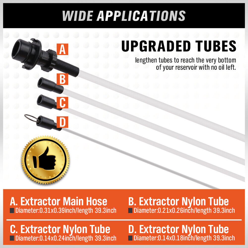 - Suitable for the extraction of all types of engine oil, gear oil, coolant fluid, power steering fluid, brake fluid from cars, motorcycles, marine engines, stationary engines and industrial machinery.