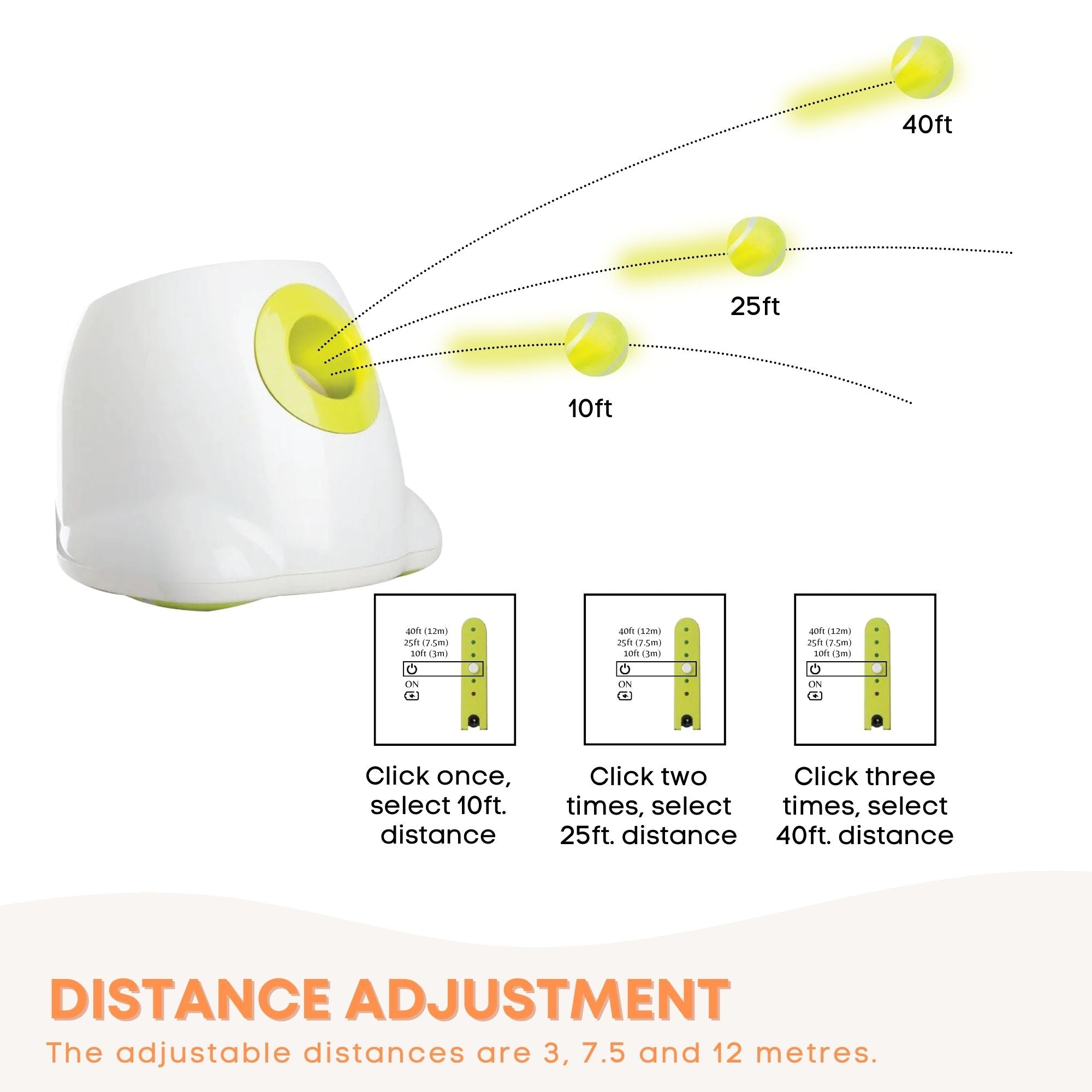 • Adjustable Distance Settings – make it throw 10ft (3m), 25ft (7.5m) or 40ft (12m). Great training tool for both older dogs and as a way to tire out energetic puppies.