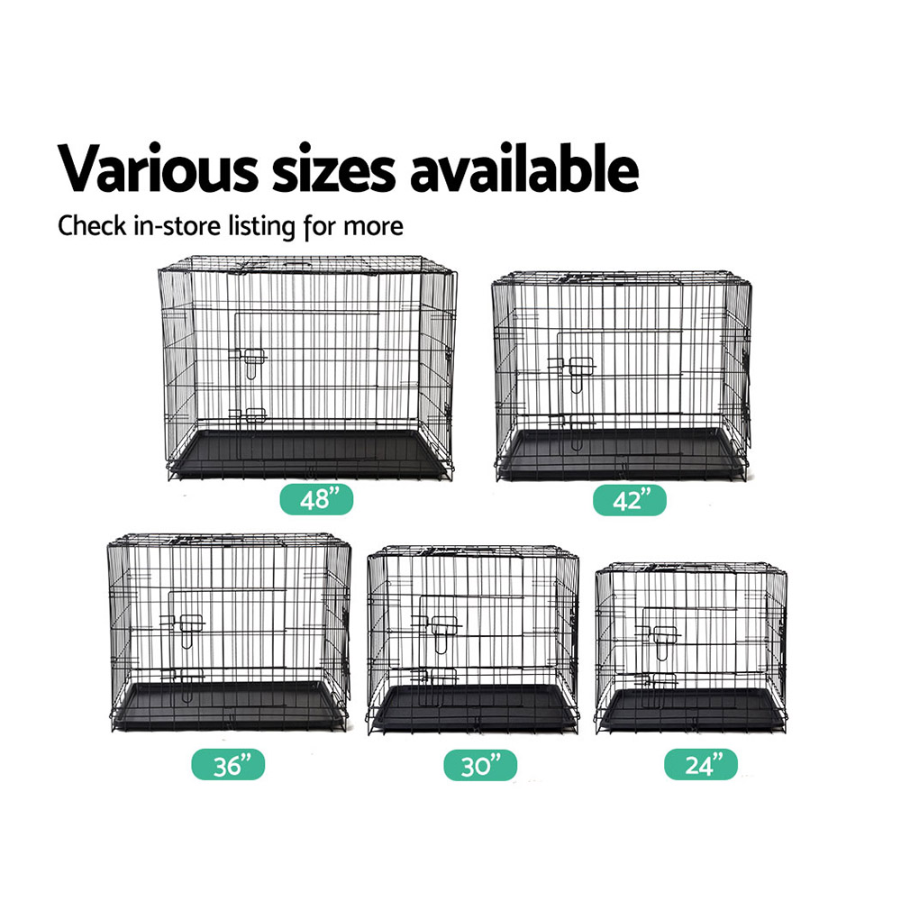 Featuring a foldable design with triple access doors, this dog cage offers maximum convenience and is extremely safe for containing your pets. It’s metal constructed with a powder coated finish enhancing durability and is also rust resistant. Easy to setup, store, transport and clean, an absolute hassle free purchase! Great for securely keeping your pets contained, a must have for every pet owner.