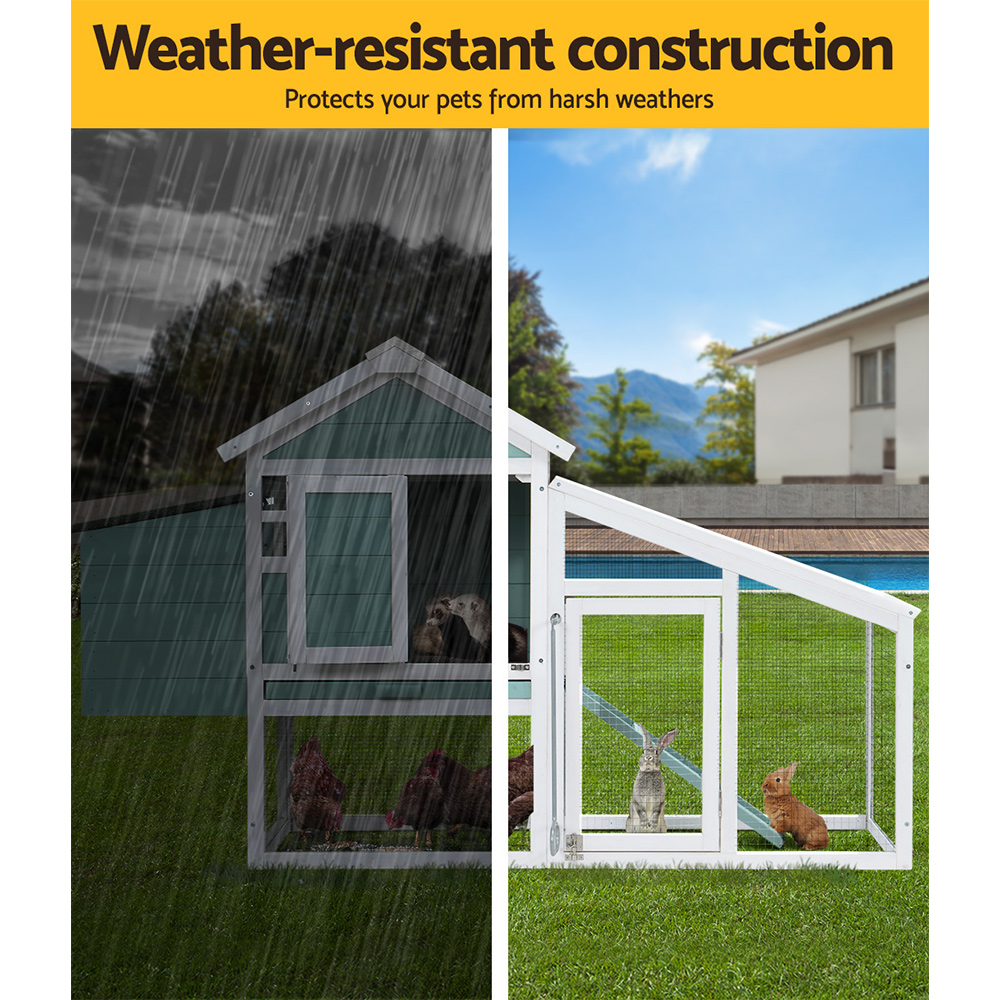 Give your beloved pets a safe and comfortable home to sleep, rest, play, and relax. The i.Pet’s pet hutch makes a cosy home for your dear pets they will love and cherish forever. This pet hutch is suitable for smaller pets such as rabbits, chickens, hens, guinea pigs, hamsters, chinchillas and ferrets. Our pet hutch features a solid fir wood construction with galvanised mesh that ensures its sturdiness and durability for many years. It has a stable and firm base with strong metal support rod that’s crucial for stability. Our pet hutch has green asphalt felt roof that provides good protection from sun and rain, keeping them cool in summer and warm in winter. It has a spacious integrated ground enclosed play area that allows your pets to have a great playtime outdoors. And the built-in foldable ramp that connects the ground area and hutch enables convenient entry and exit. Furthermore, the pet hutch also comes with a hatching box for egg collection and a slide-out tray for easy cleaning, and the entrance door with sturdy security locks makes it even more convenient and reliable. The enclosed play area has a mesh structure, which keeps your pets comfortable and well-ventilated. This pet hutch will give your beloved pets the utmost joy and pleasure. Gift this pet hutch to your pets today, and be sure to get much love in return.