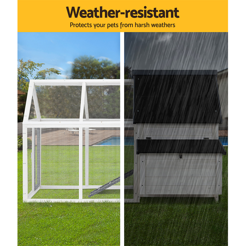 Give your beloved pets a safe and comfortable home to sleep, rest, play, and relax. The i.Pet’s pet hutch makes a cosy home for your dear pets they will love and cherish forever. This pet hutch is suitable for smaller pets such as rabbits, chickens, hens, guinea pigs, hamsters, chinchillas and ferrets. Our pet hutch features a solid fir wood construction with galvanised mesh that ensures its sturdiness and durability for many years. It has a stable and firm base that’s crucial for stability. Our pet hutch has black asphalt felt roof that provides good protection from sun and rain, keeping them cool in summer and warm in winter. It has a spacious integrated ground enclosed play area that allows your pets to have a great playtime outdoors. And the built-in foldable ramp that connects the ground area and hutch enables convenient entry and exit. Furthermore, the pet hutch also comes with a hatching box for egg collection and a slide-out tray for easy cleaning, and the front entrance door with sturdy security locks makes it even more convenient and reliable. The enclosed play area has a mesh structure, which keeps your pets comfortable and well-ventilated. This pet hutch will give your beloved pets the utmost joy and pleasure. Gift this pet hutch to your pets today, and be sure to get much love in return.