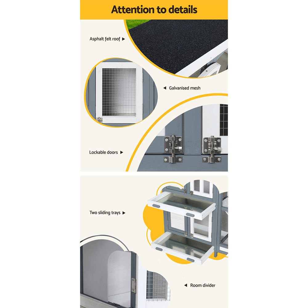 Rabbits love to hop, hide, stretch, leap, do a flop or binky, and race around. These behaviours are essential to making sure they are normal. So why not give them the home they deserve? The i.Pet’s rabbit hutch, specially designed for cute bunnies, is good stuff your rabbits need to act like rabbits. Your bunnies will love it so much that they will rub their chins all over this rabbit hutch to mark their territory and do a happy dance. Not just rabbits, it makes a comfortable home to guinea pigs, hamsters, chinchillas, and ferrets too. Built from solid fir wood with galvanised mesh, our rabbit hutch is sturdy and durable. It has a firm base that ensures stability and prevents tilting even with your bunnies hopping and spinning to a great extent. The asphalt felt roof offers good protection from sun and rain, keeping your pet cat cool in summer and warm in winter. Rain or shine, this rabbit hutch will provide unlimited hours of entertainment and fun to your beloved bunnies. Our rabbit hutch has built-in ramps that connect different floors, room dividers, entrance doors with locks for convenient entry and exit, and two sliding trays to collect droppings and easy cleaning. Nice and roomy, the rabbit hutch boasts a mesh design that allows proper airflow and keeps your pets well-ventilated. Gift our i.Pet’s rabbit hutch to your bunnies today, and be sure to get much love in return. It’s sure to give your beloved bunnies the utmost joy and pleasure.