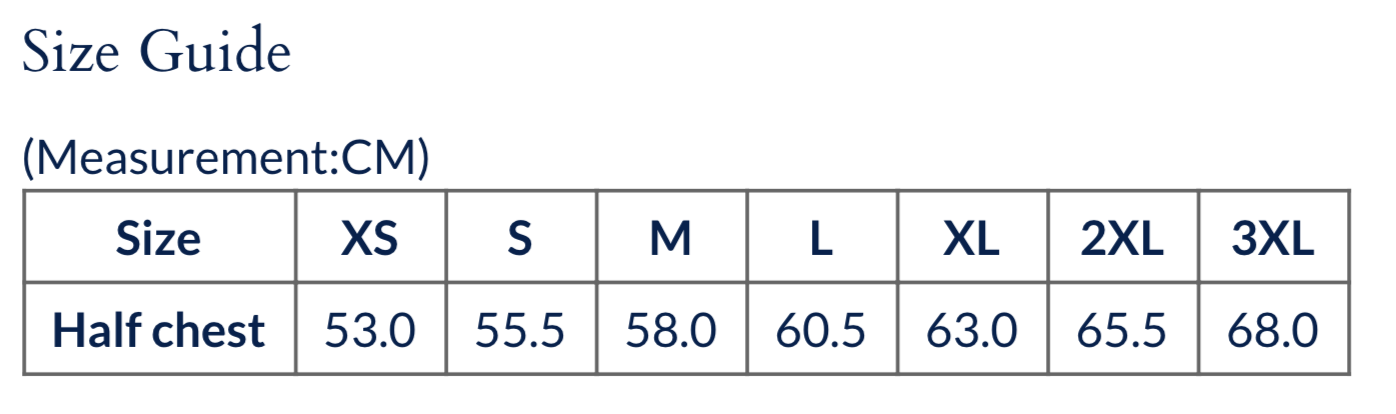 | Half chest | 53.0 | 55.5 | 58.0 | 60.5 | 63.0 | 65.5 | 68.0 |