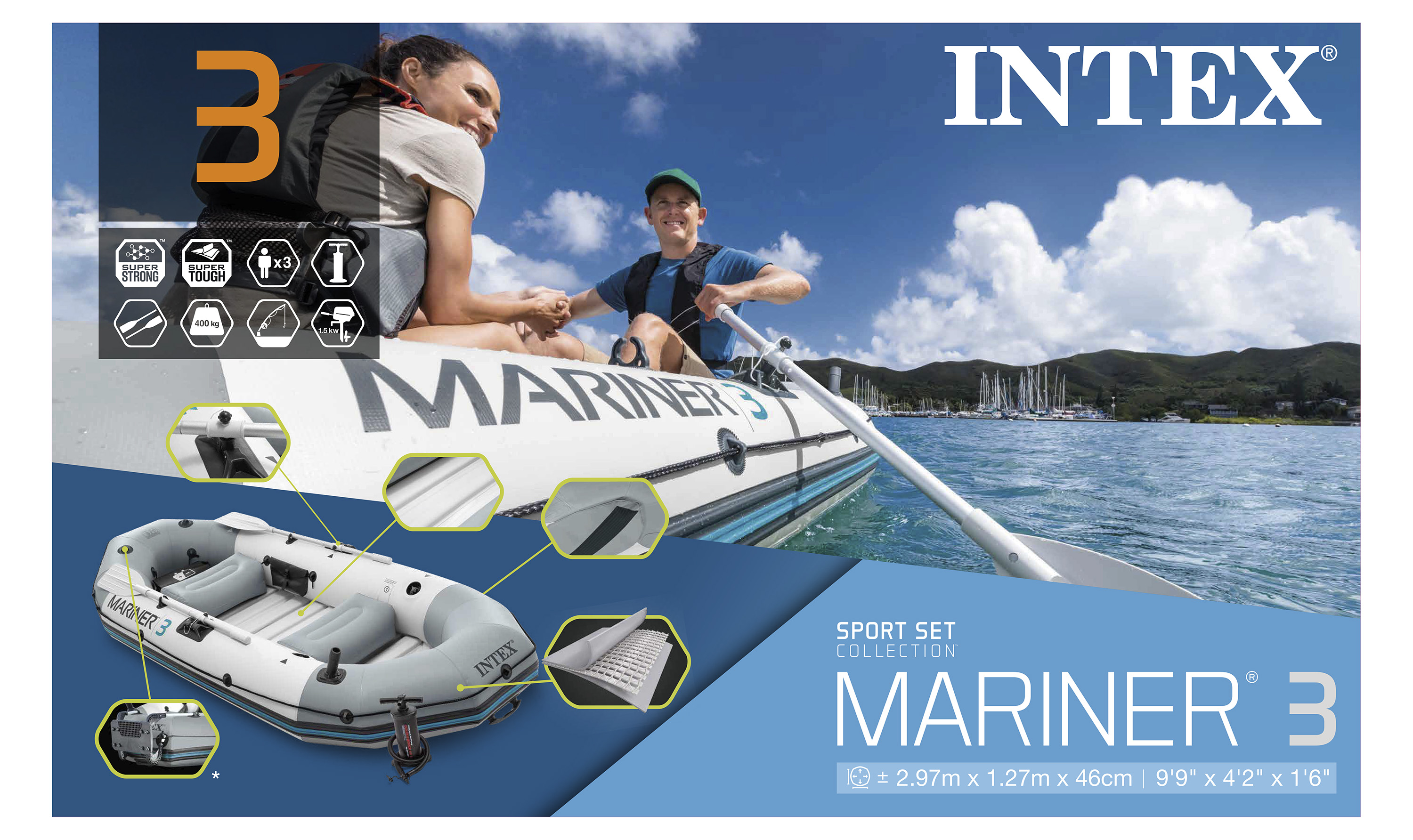 INTEX� Mariner 3 Boat Set 68373The Intex Mariner 3 Rigid Inflatable Boat features a hard rigid floor, making it their best hunting/fishing boat by far. Here’s why: the rigid floor in the Intex Mariner 3 inflatable boat provides unmatched stability so you can stand up and cast during calm stretches of the river.