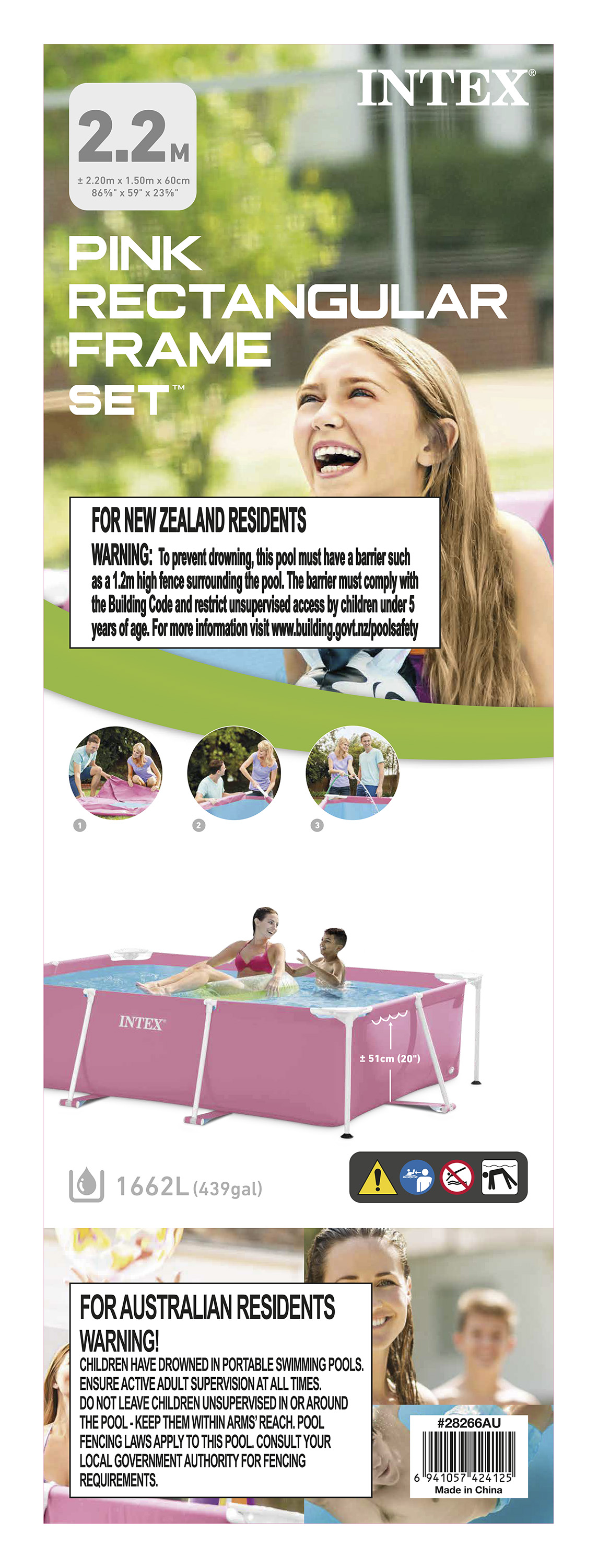 Splash away in our new Pink Rectangular Frame Pool! Perfectly sized for smaller spaces and families, this pool is supported by strong, durable steel frames and laminated sidewalls. Added features include a convenient drain plug and connection holes for optional filter pumps. Pink paradise awaits!