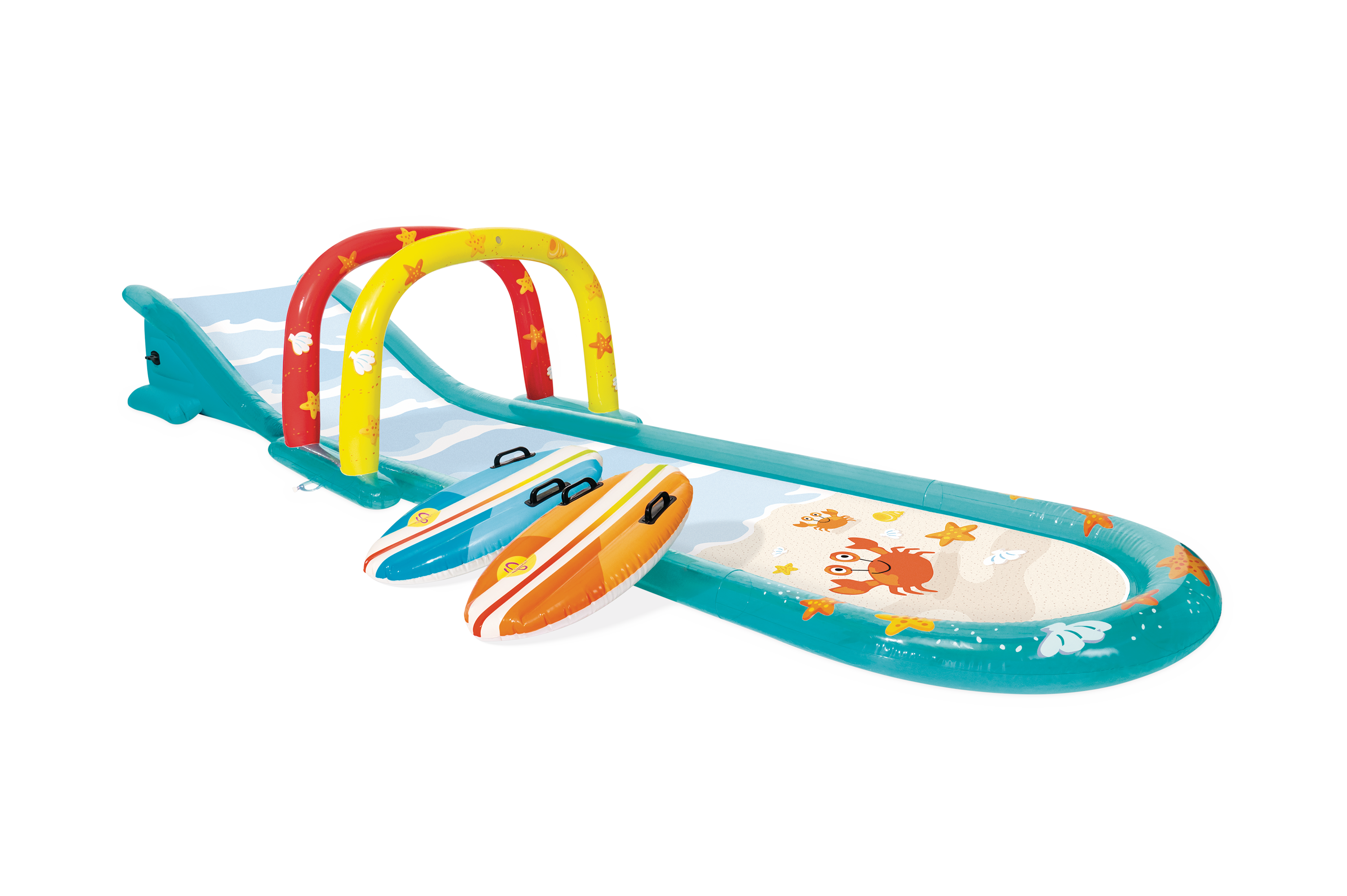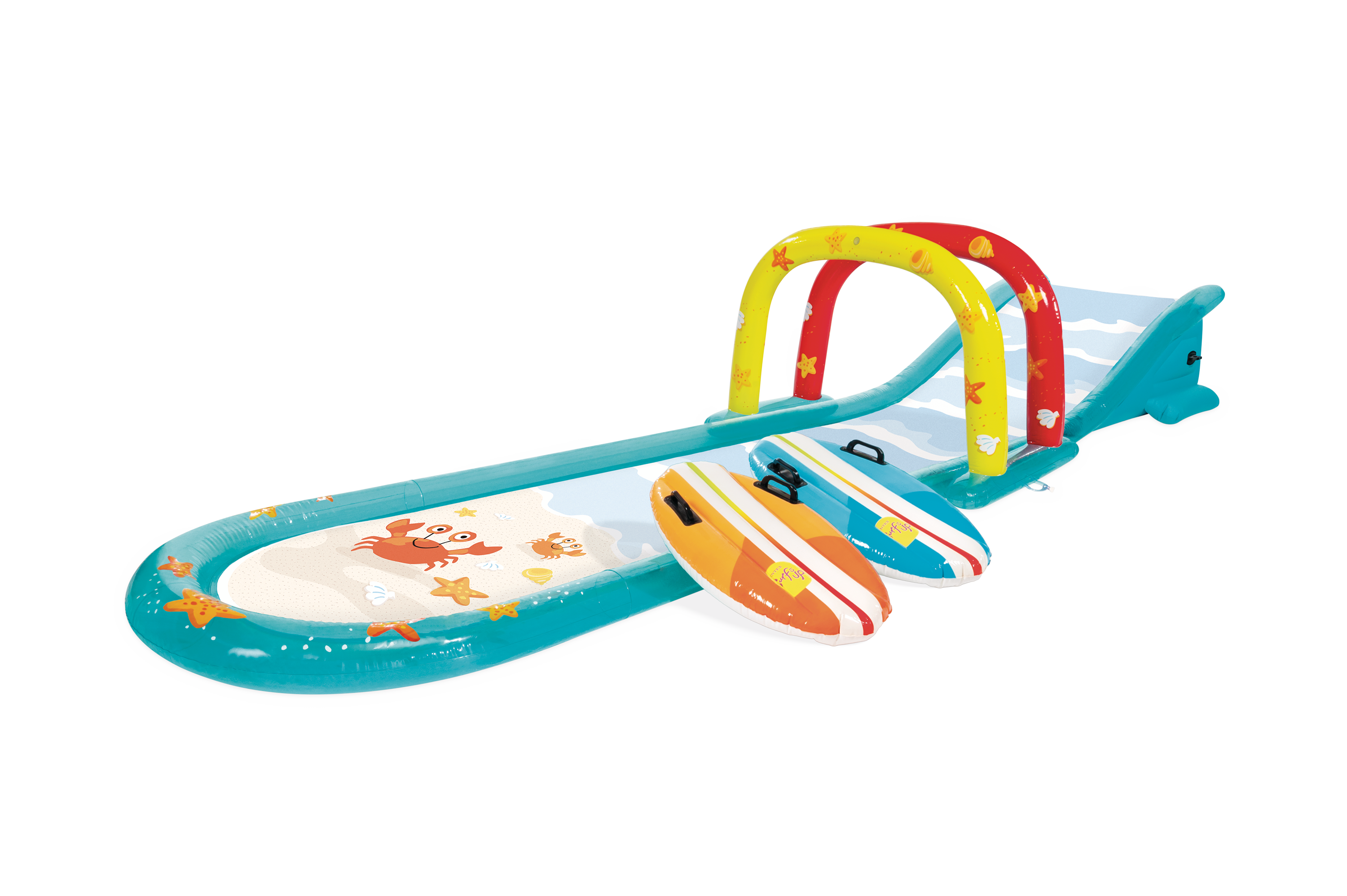 Surf’s up��in your own backyard! Your kids can pretend they’re barrelin’ down a tasty wave on inflatable surf riders as built-in sprayers keep them cool.