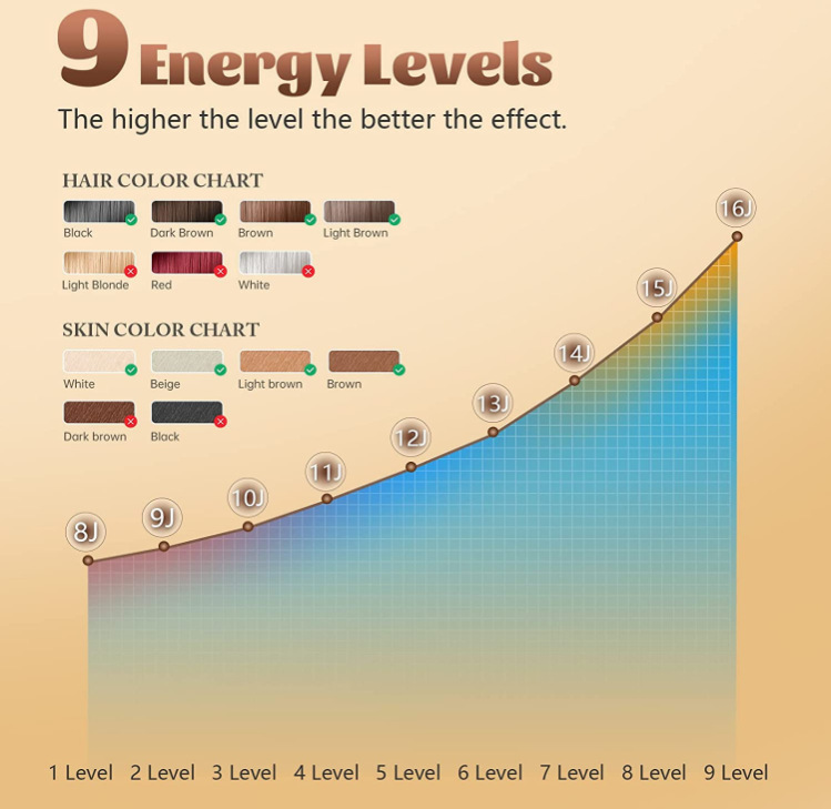 9 Adjustable Energy Levels: Customize the intensity to suit your skin type and hair density for optimal comfort and effectiveness.