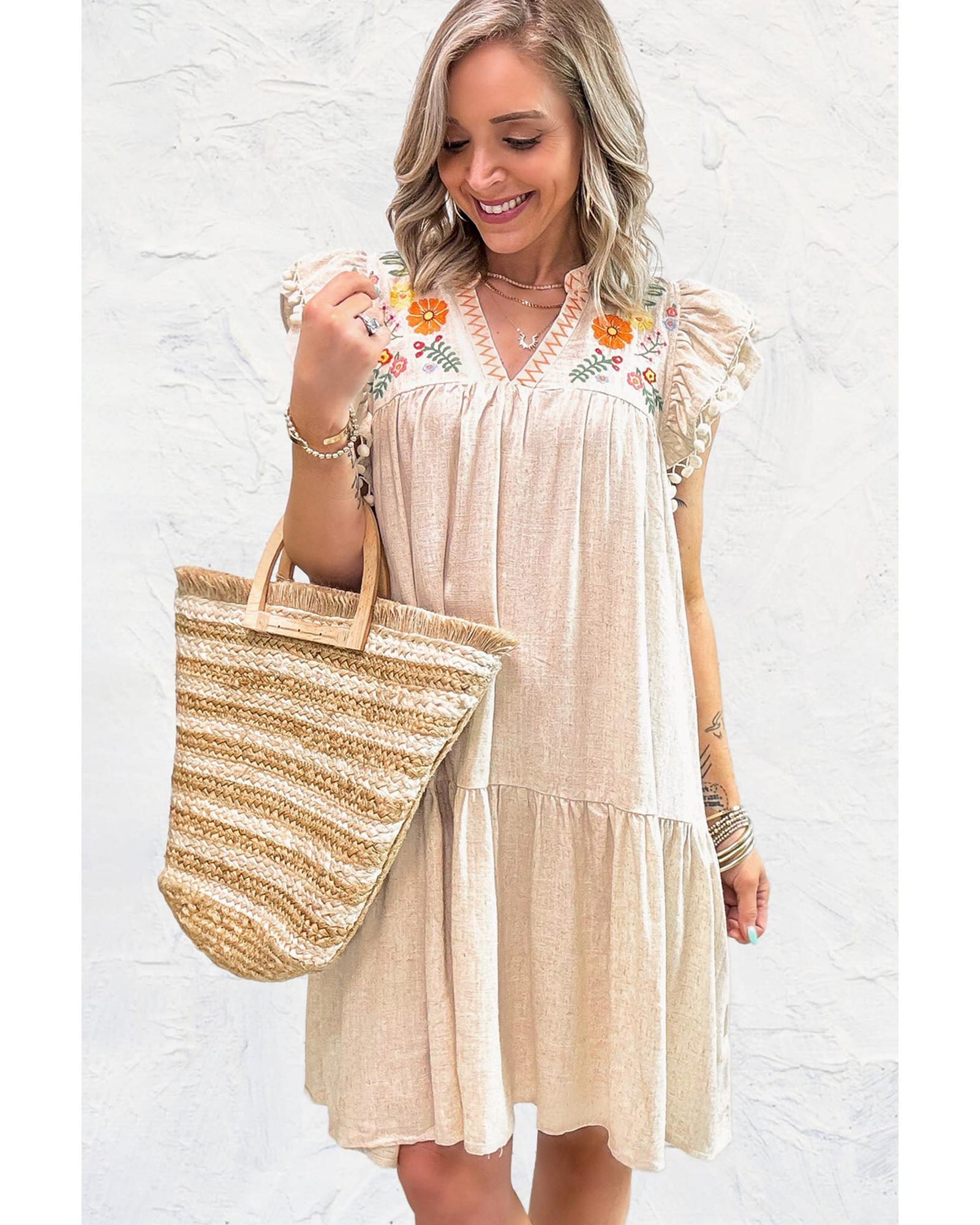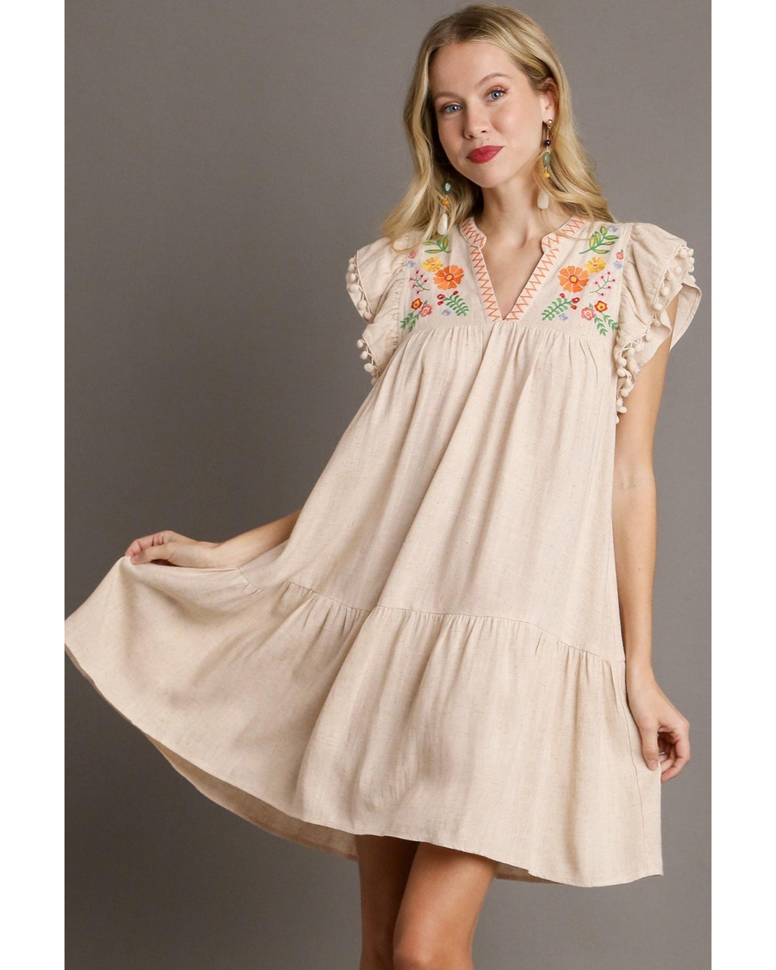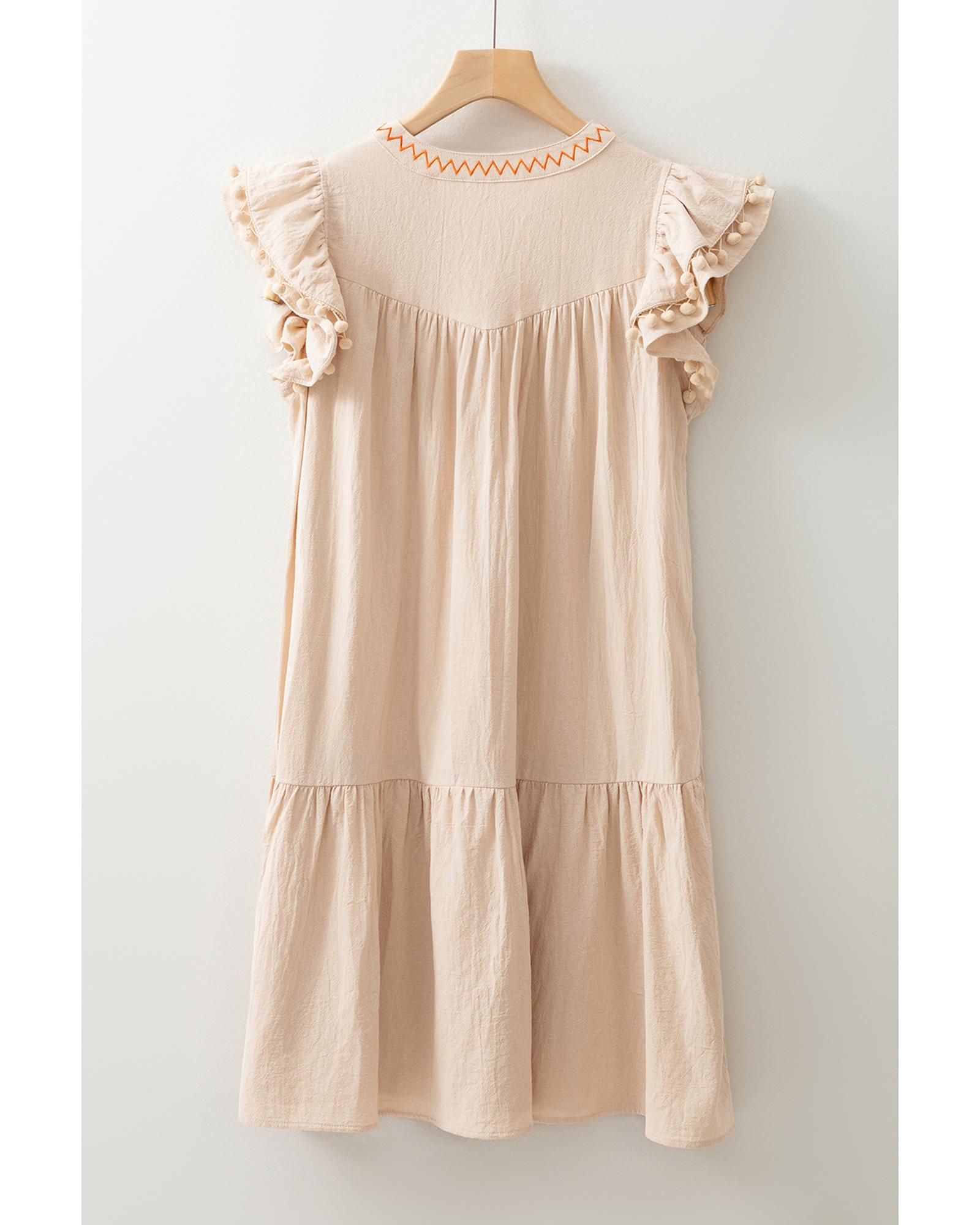 Jet Stream Linen Embroidery Split Neck Pom Pom Ruffle Sleeves Flowy Short Dress – S