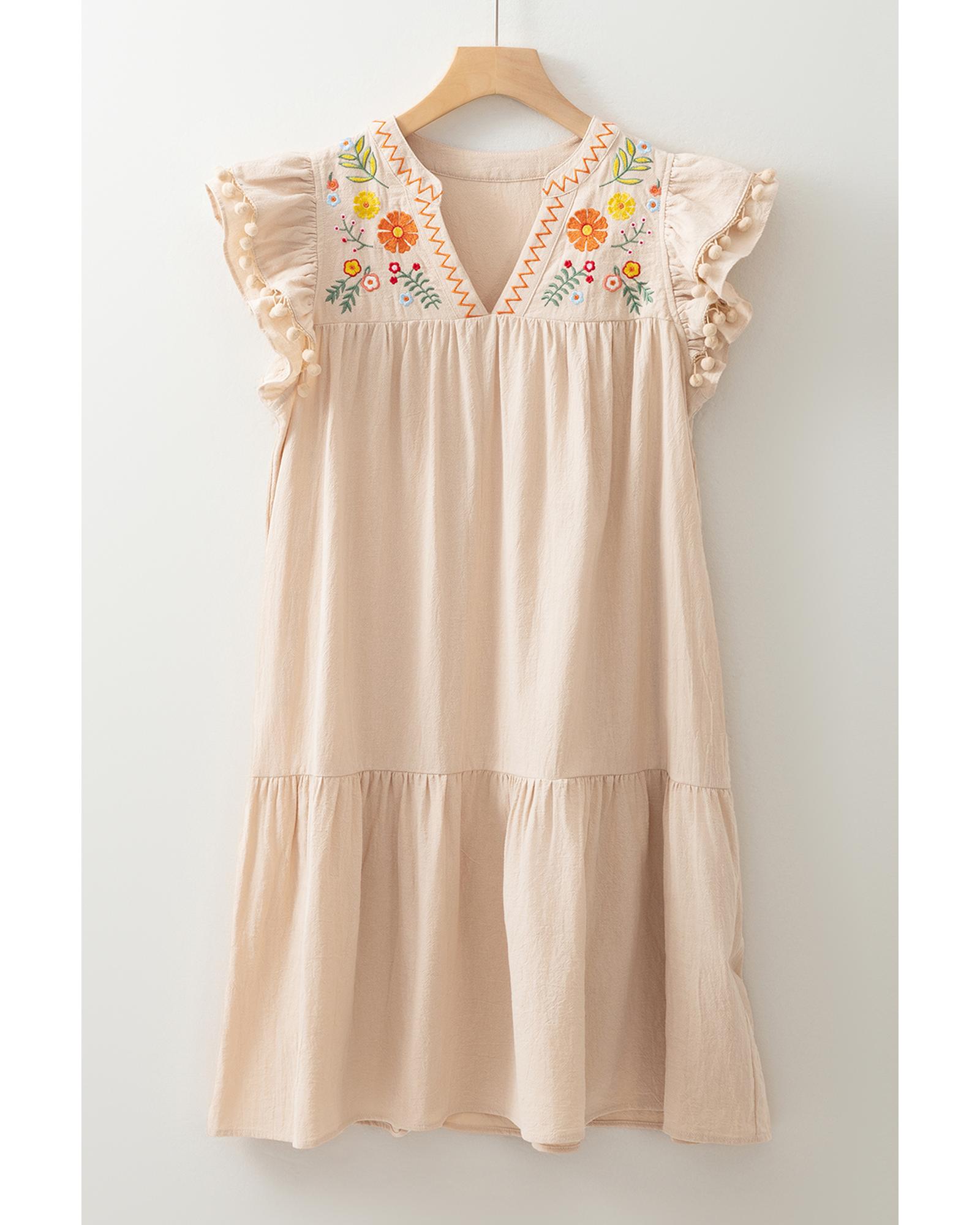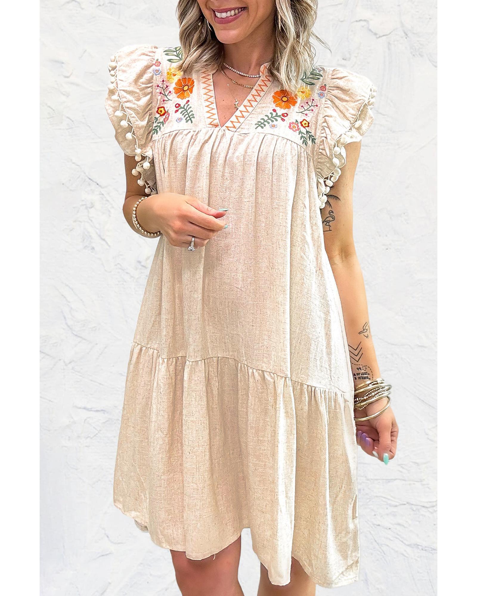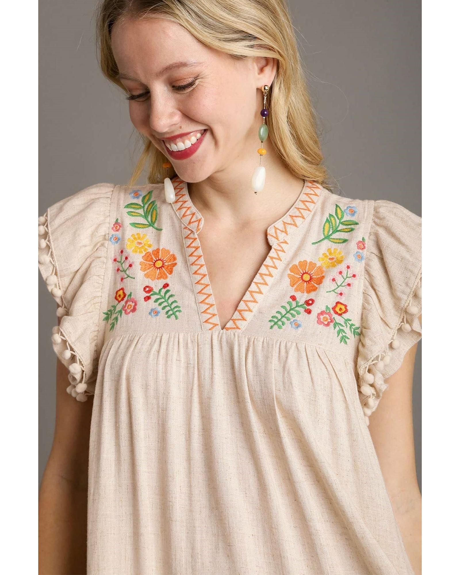 Jet Stream Linen Embroidery Split Neck Pom Pom Ruffle Sleeves Flowy Short Dress – XL
