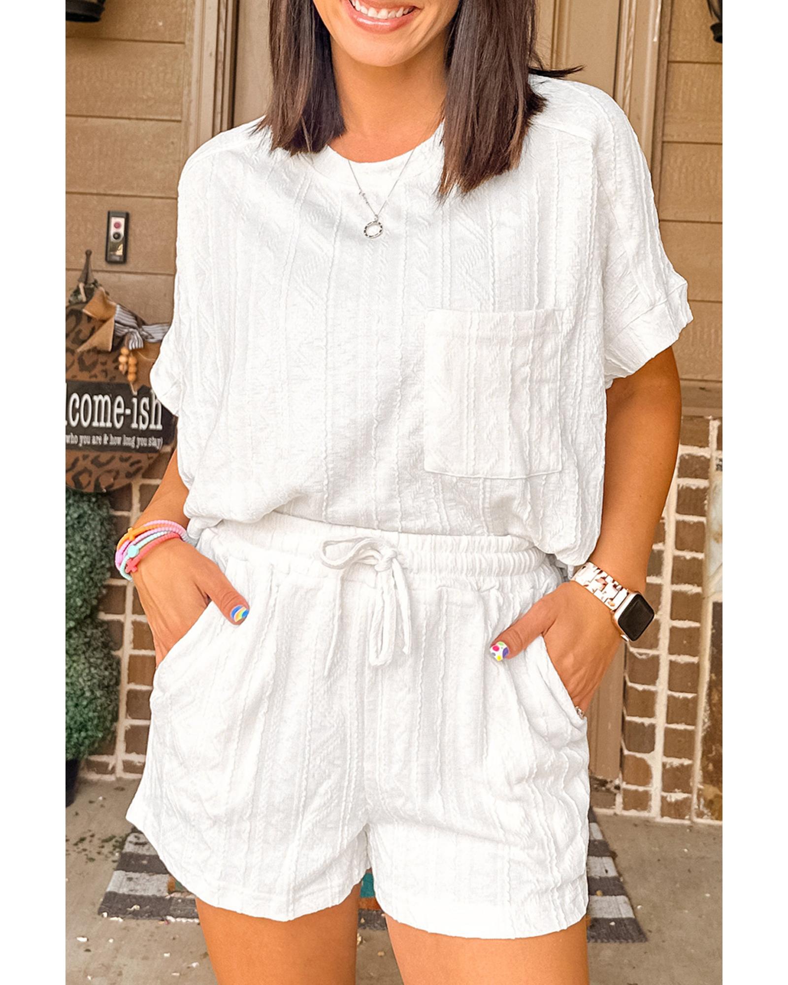 Jet Stream Textured Patched Pocket Short Sleeve Top Drawstring Shorts Set - S