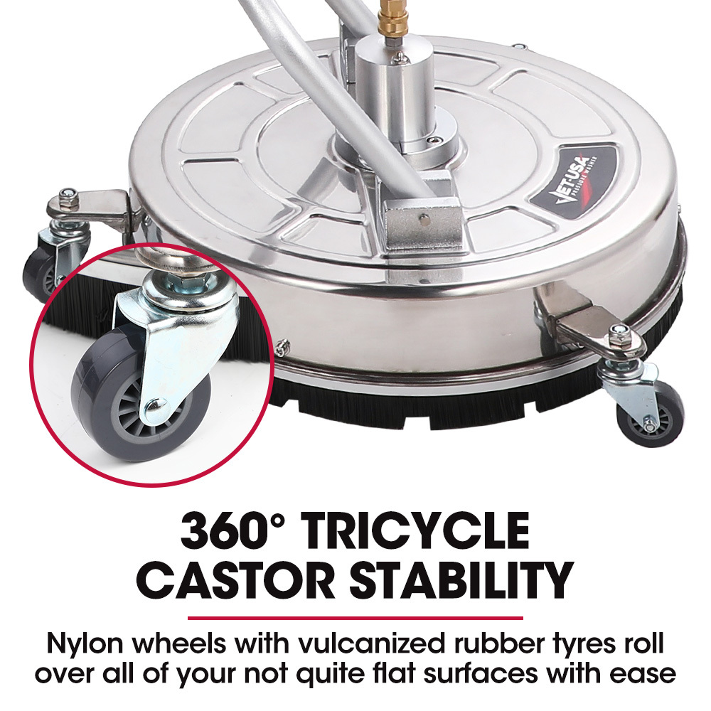 The Jet-USA has a stainless steel body with two nozzles spinning at 2500 RPM mounted on 3 corrosion-resistant castors for consistent coverage. Powered by up to 4000 PSI this heavy-duty cleaning disc delivers the outstanding results you’ve come to expect from Jet-USA.