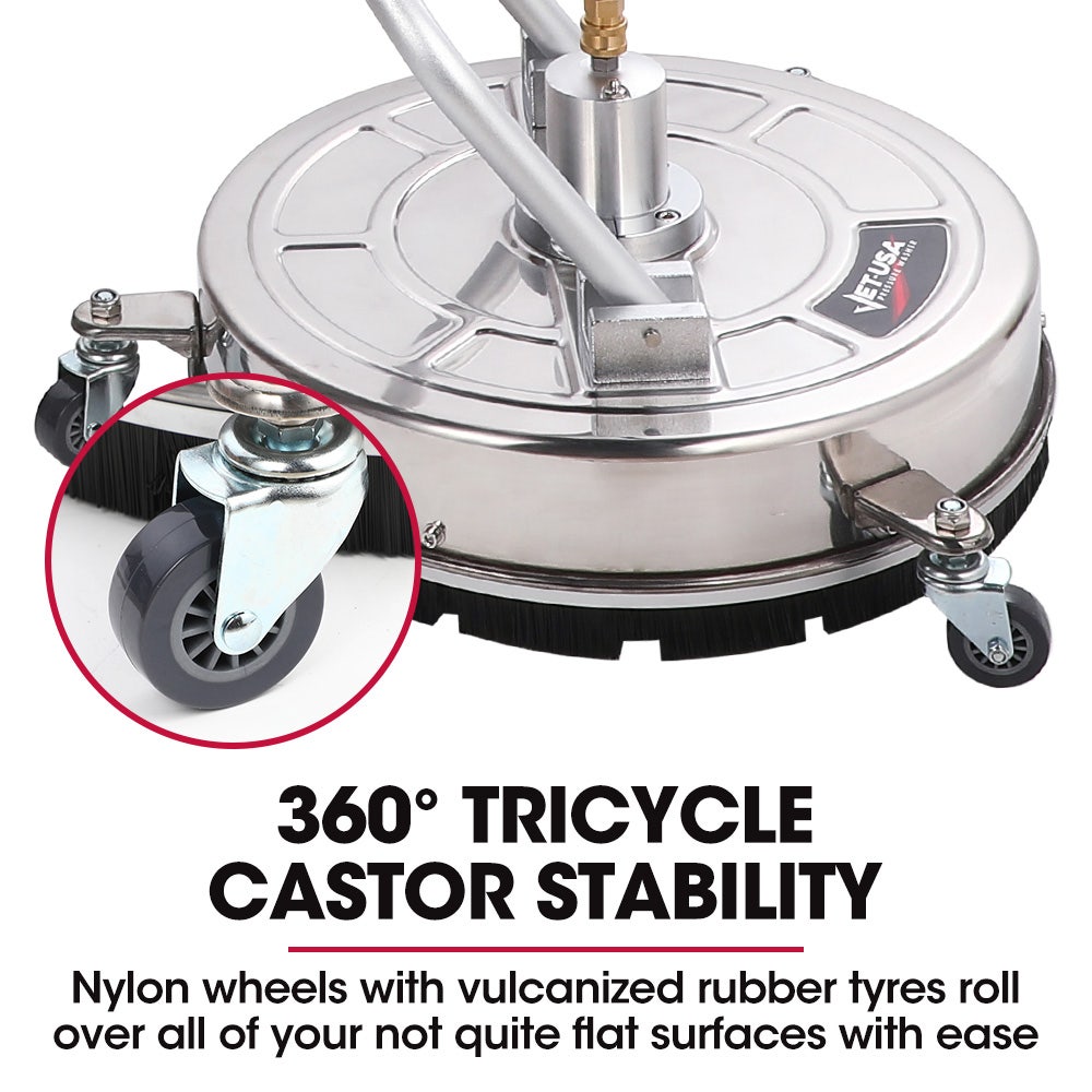 The Jet-USA 21′ Stainless Steel Pressure Washer Surface Cleaner Attachment is the perfect tool to clean your concrete driveway, patio, deck or garage floor. This easy gliding disk puts powerful cleaning and ease of use at your disposal with the wide 53cm cleaning area.