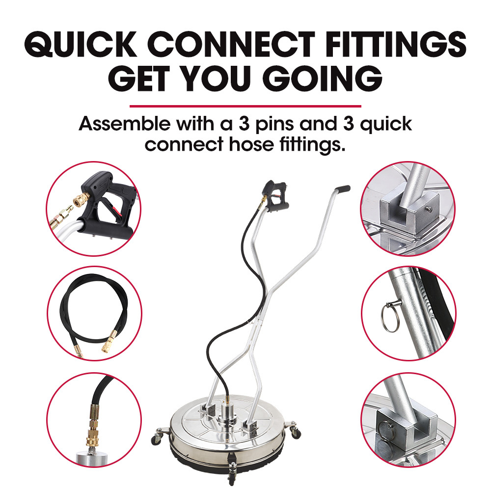 It has a standard â…œ’ quick connect fitting for use with most pressure washers. A minimum operating pressure of 2000 PSI @ 11 LPM ensures fast effective cleaning. That means you save water by saving time.