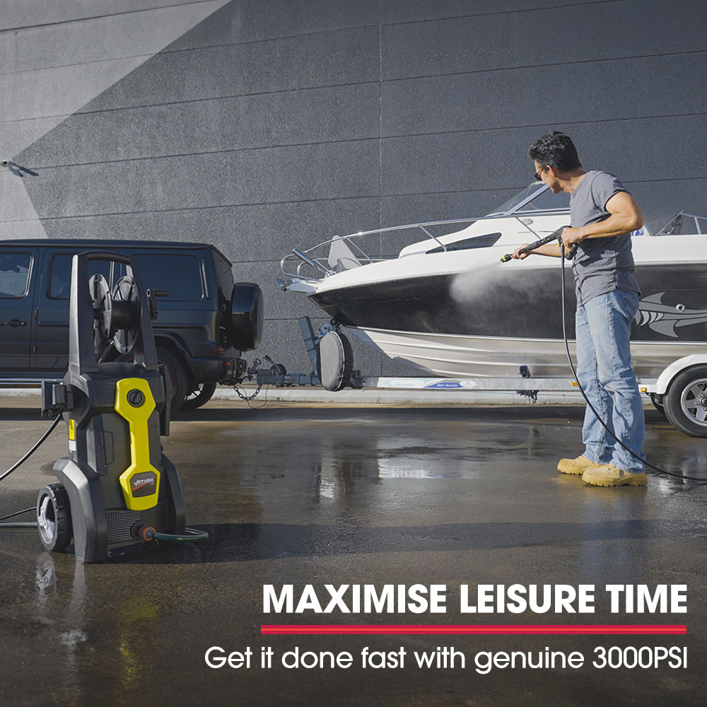 Attaching the detergent bottle and the detergent nozzle allows you to easily apply suds when cleaning cars while the rotary brush head attachment provides extra scrubbing power. The surface cleaner head is ideal for decks, paths and driveways. With a Vari-Nozzle, a Detergent Nozzle and a Turbo head, this High Pressure Washer offers versatile cleaning options to suit any task!