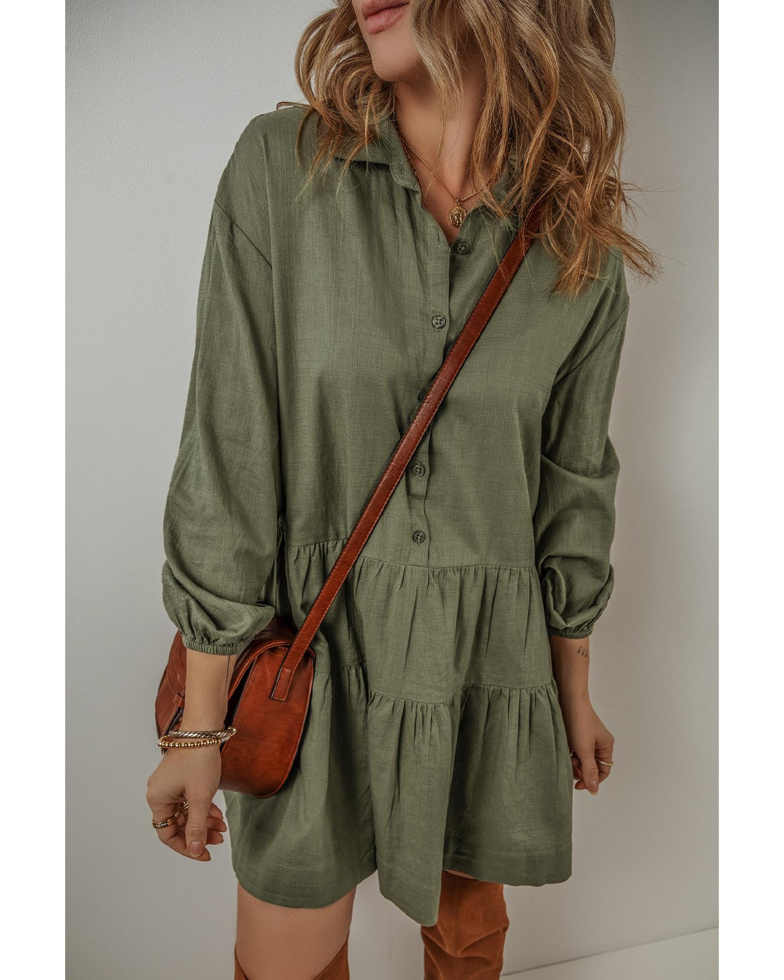 Jungle Green Puff Sleeve Buttoned Tiered Pleated Shirt Mini Dress – XL