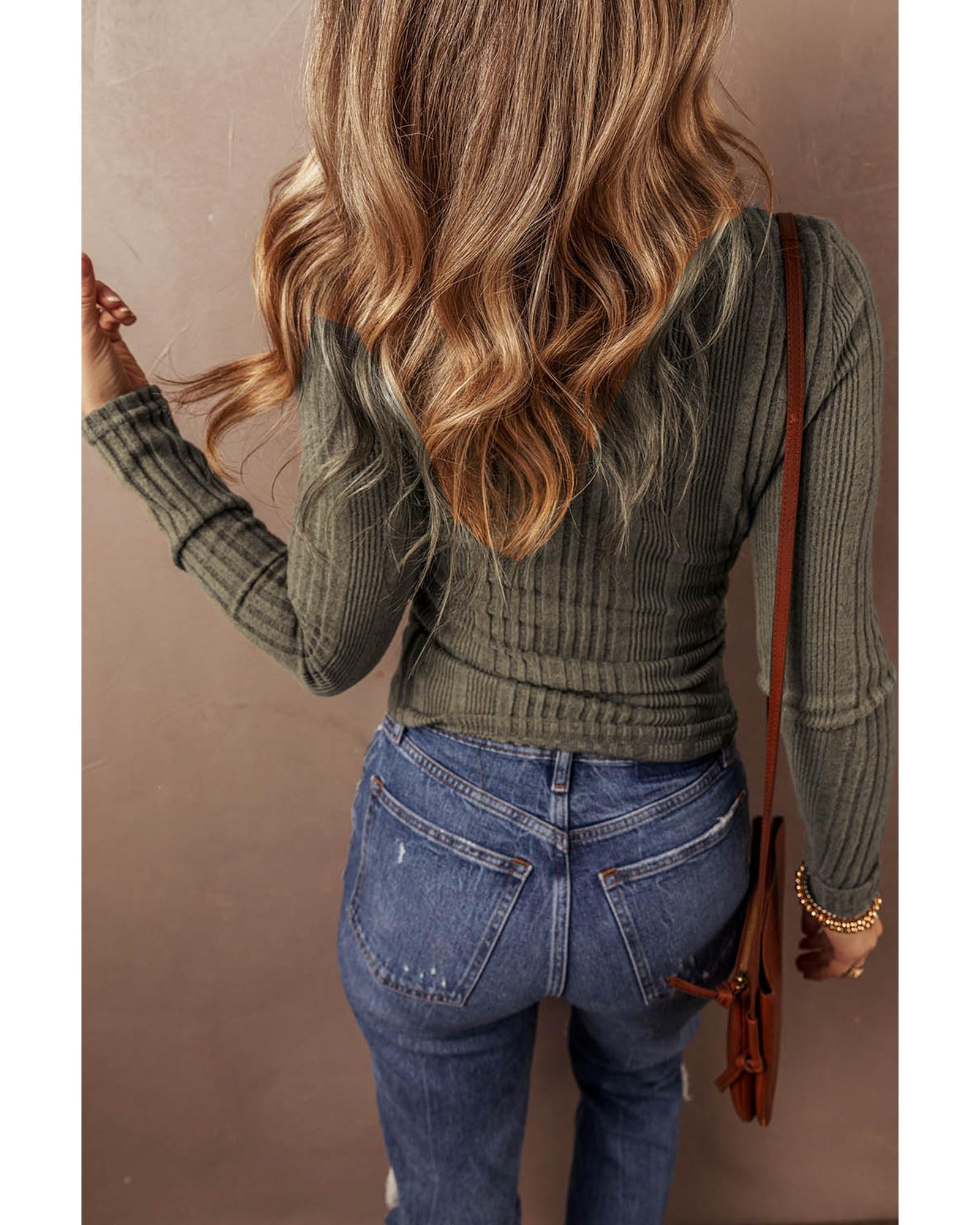 - Jungle Green Ribbed Knit Half Button Slim Fit Blouse