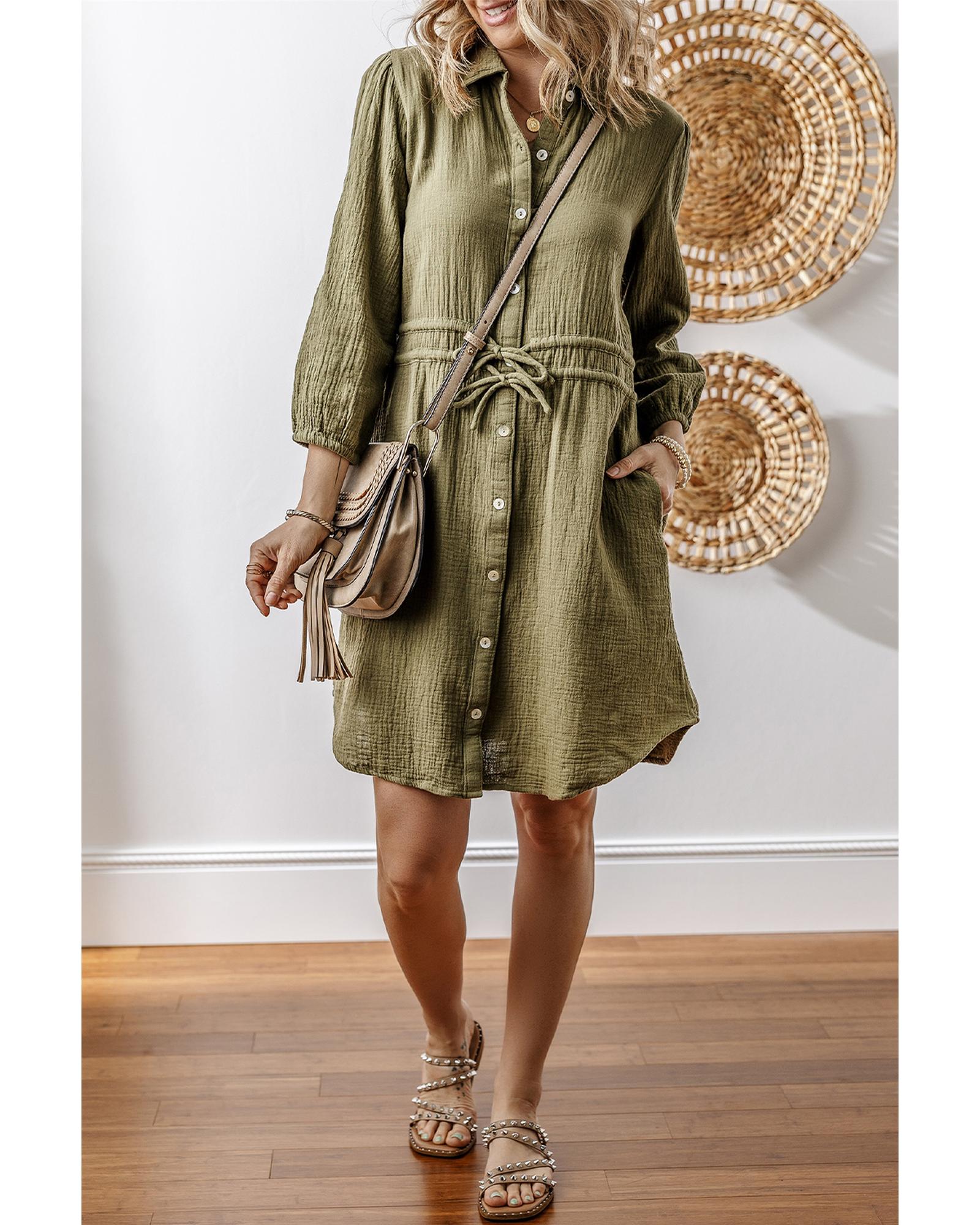 Jungle Green Textured Bracelet Sleeve Collared Button Up Dual Tied Mini Dress – L