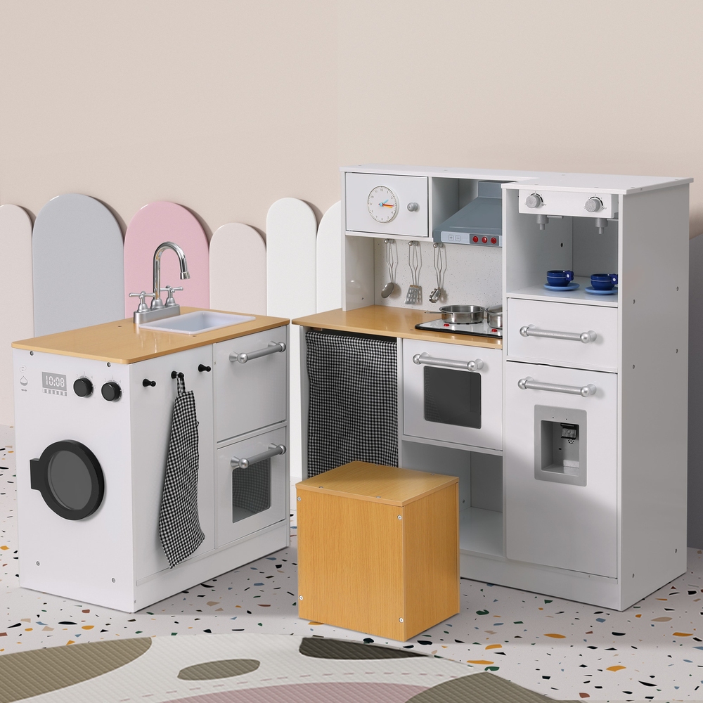 Introducing our Keezi Kids Wooden Kitchen Playset: features a sturdy MDF and solid wood construction, smooth easy-clean surfaces, ample storage, and simple assembly with detailed instructions. The perfect gift for young aspiring chefs!