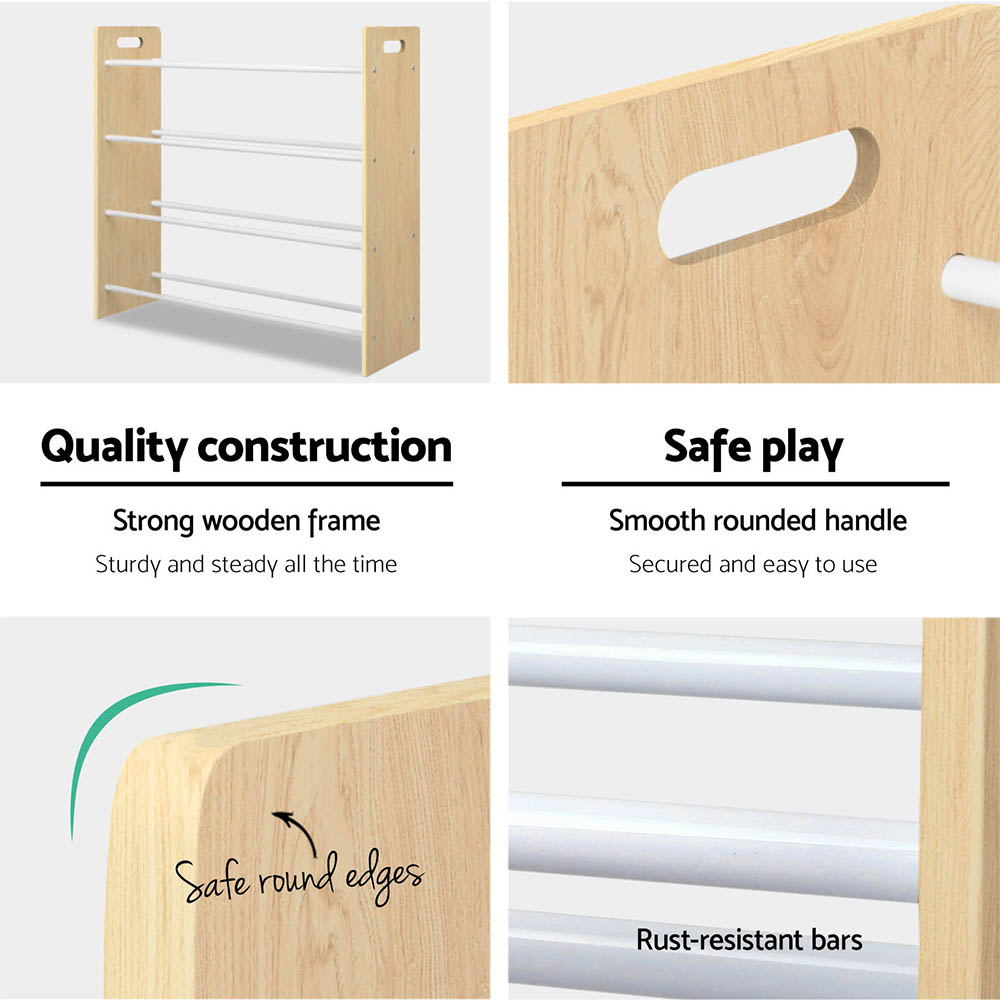 The entire unit is well-built with particle board that has strong metal tubes painted in white non-toxic paint. Easy to clean and maintain, our Multi-bin Toy Rack is simply a joy to have for all things neat and tidy.