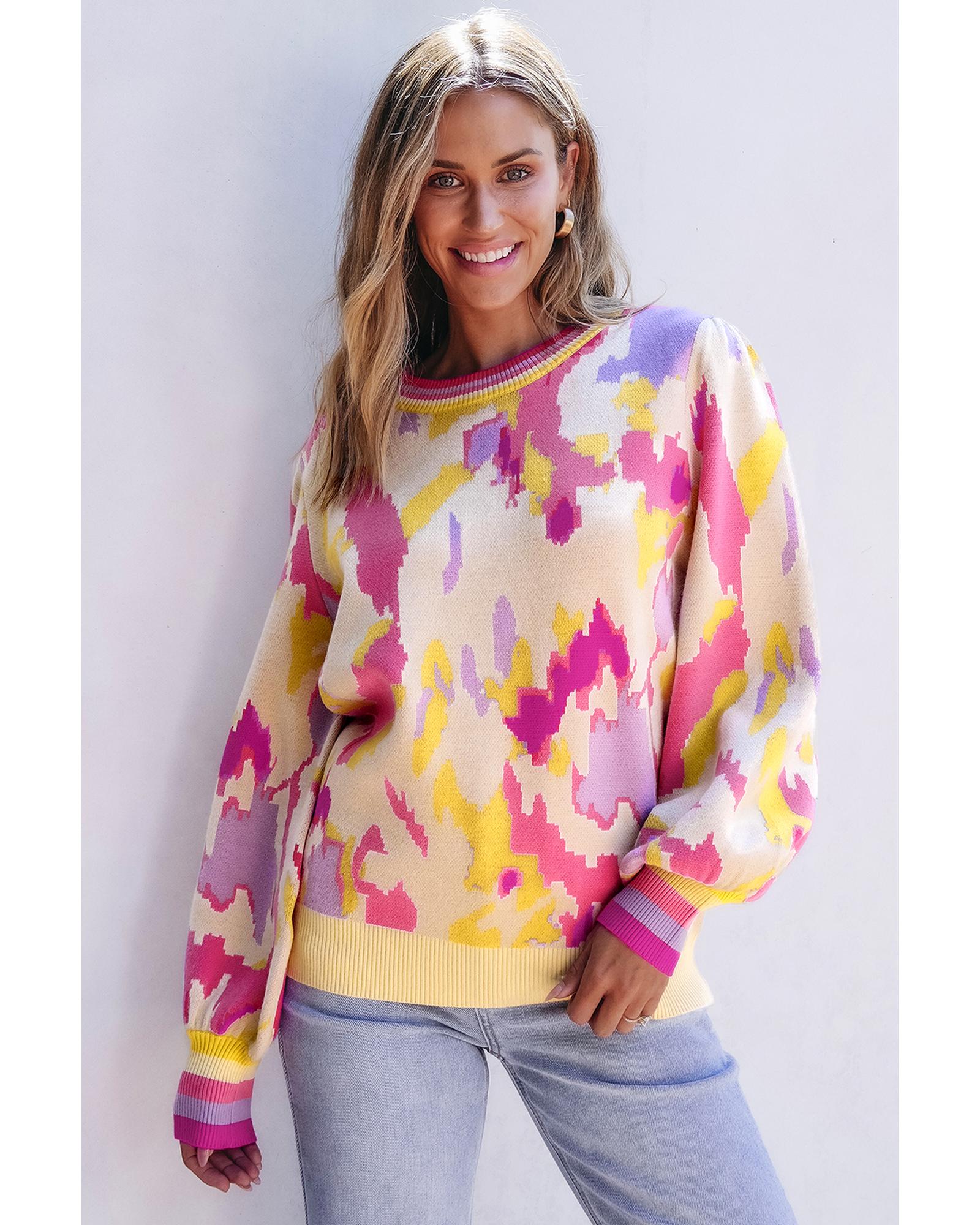 - Khaki Abstract Print Colorblock Balloon Sleeve Sweater