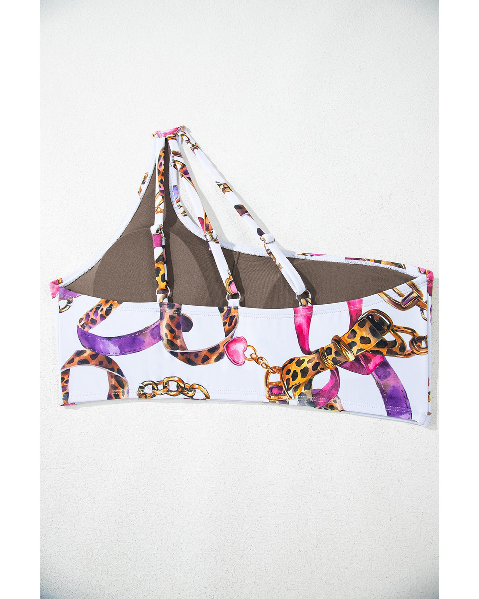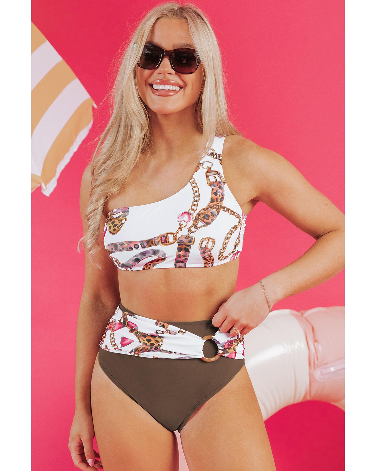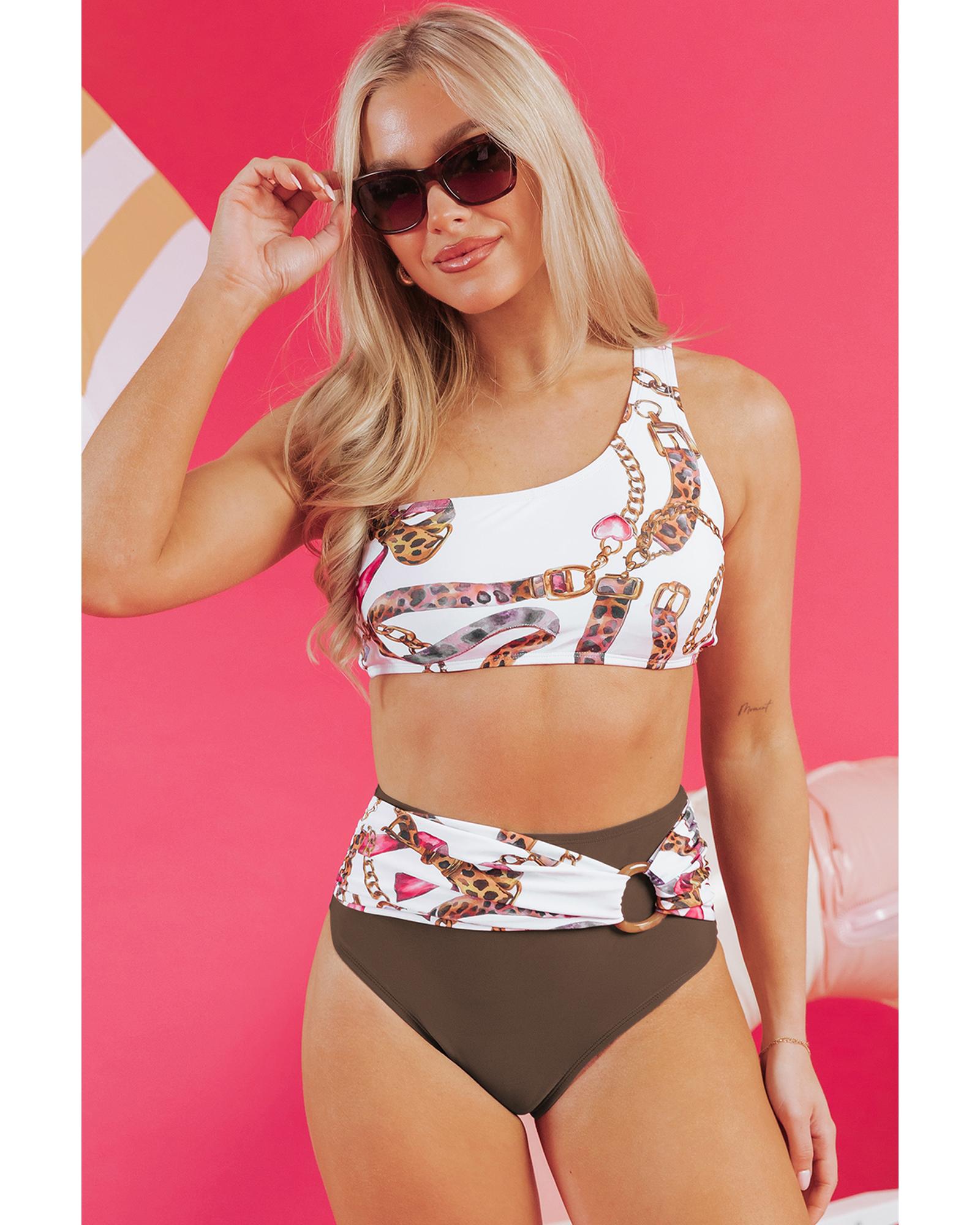 Khaki Abstract Print One Shoulder Ring Linked High Waist Bikini – S