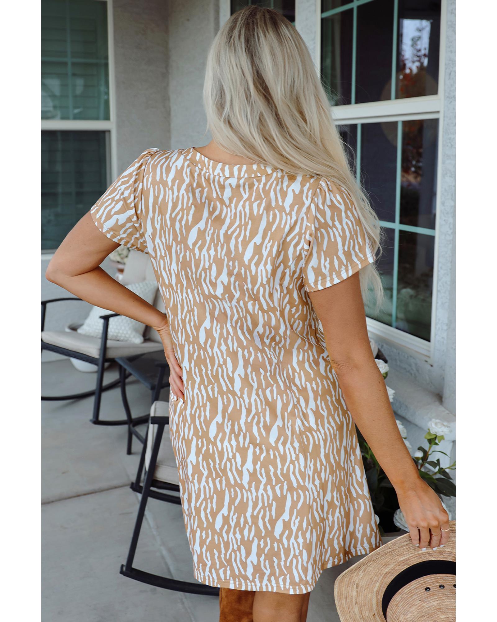 Khaki Abstract Print V Neck Short Sleeve Shift T Shirt Dress – S