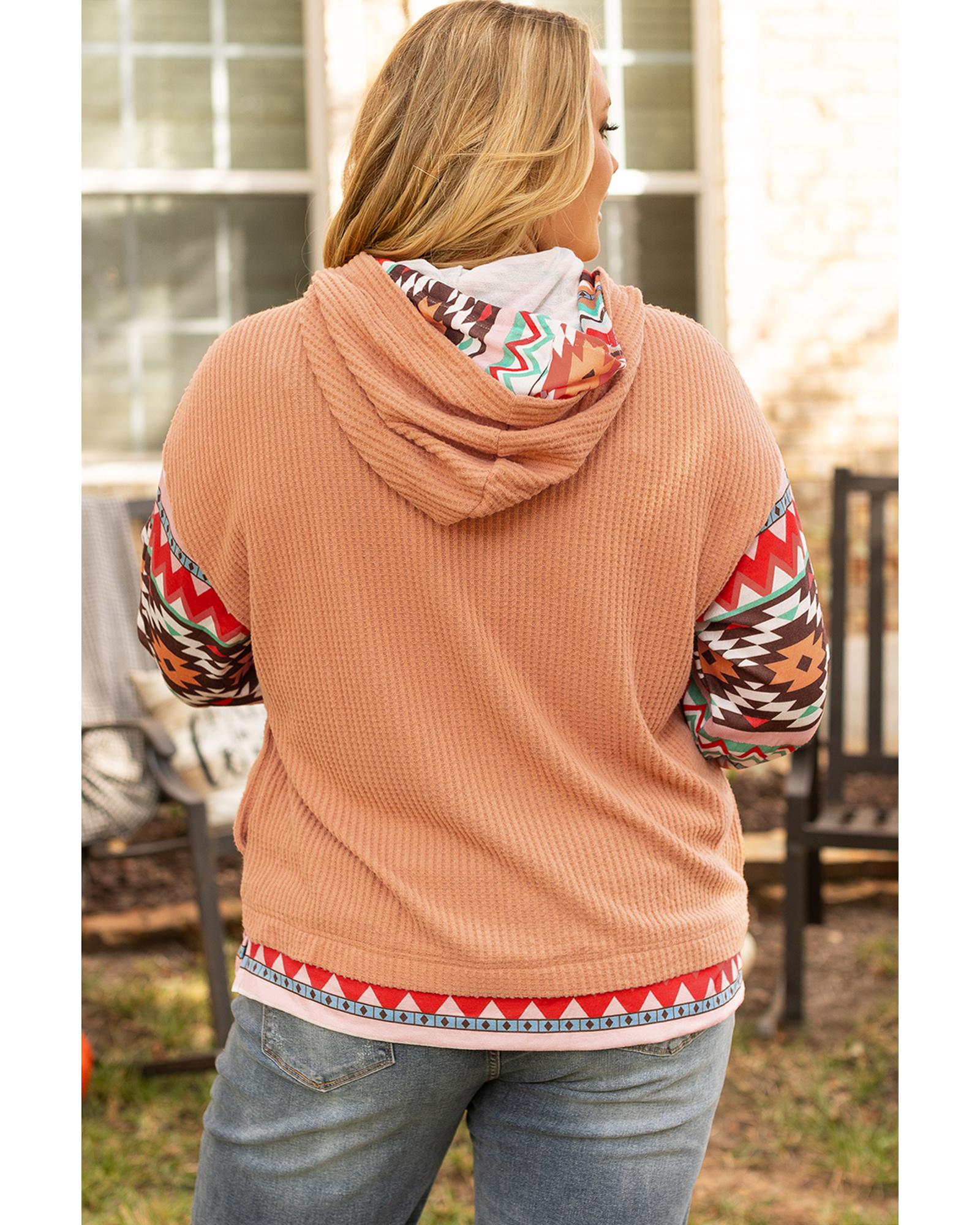 Khaki Aztec Patchwork Waffle Knit Plus Size Hoodie – 1X