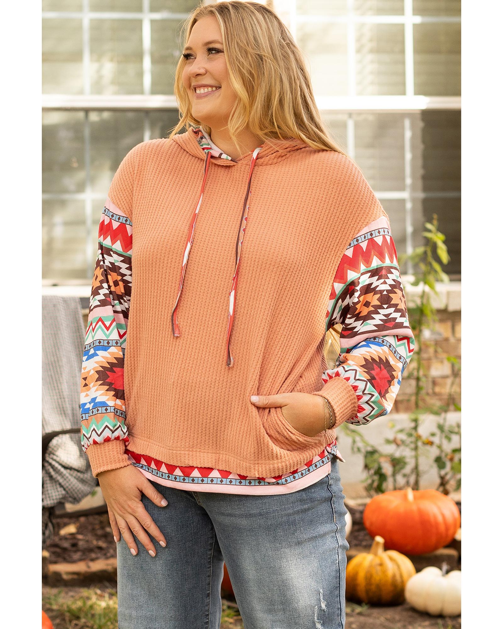Khaki Aztec Patchwork Waffle Knit Plus Size Hoodie – 2X