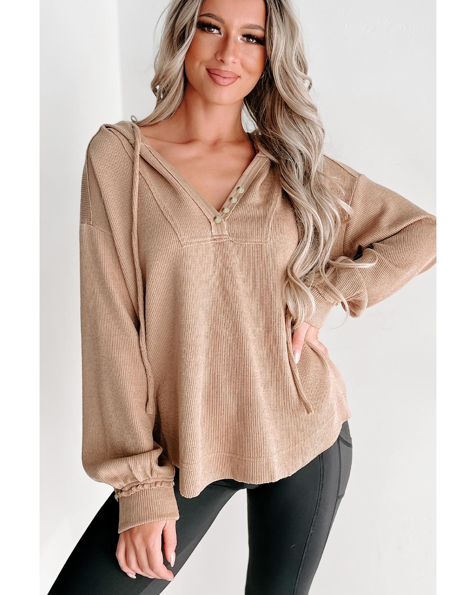 Khaki Buttoned V Neck Drawstring Knit Hoodie – M