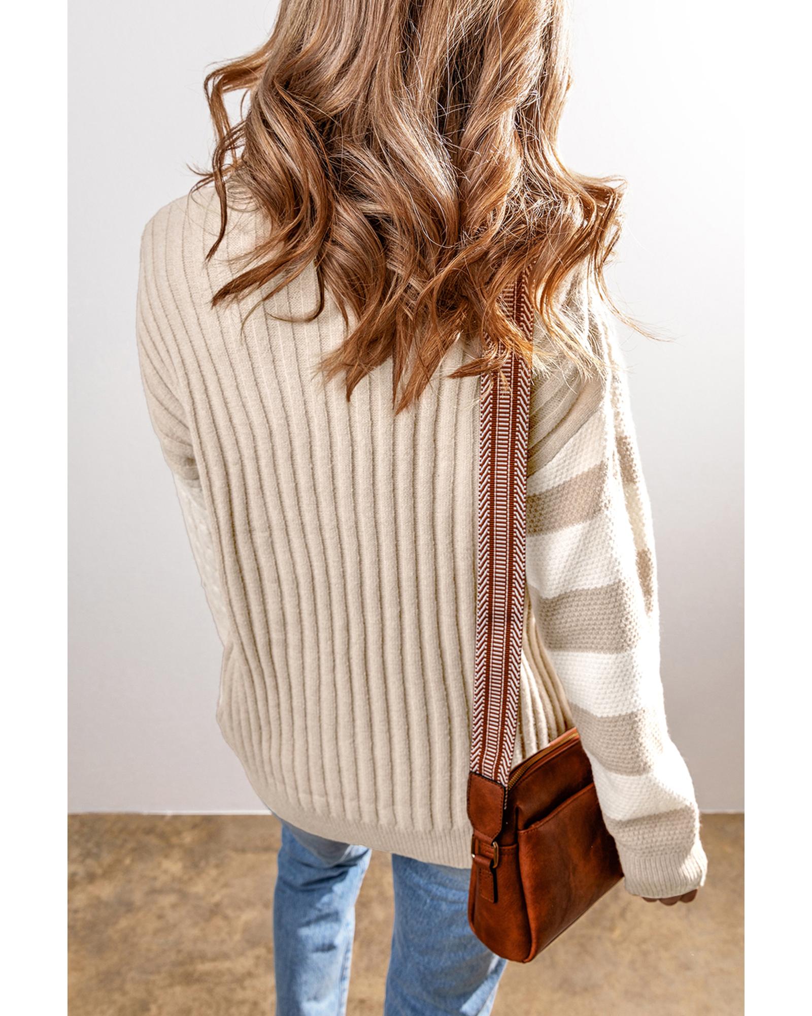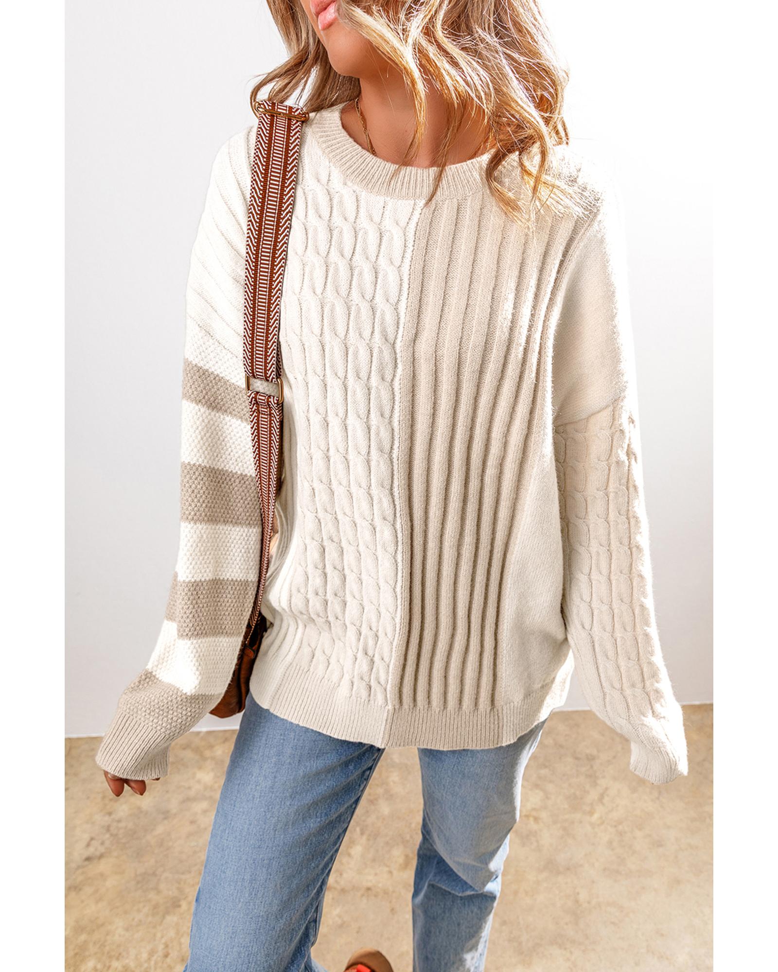 Khaki Cable Knit Colorblock Crew Neck Drop Shoulder Sweater – M
