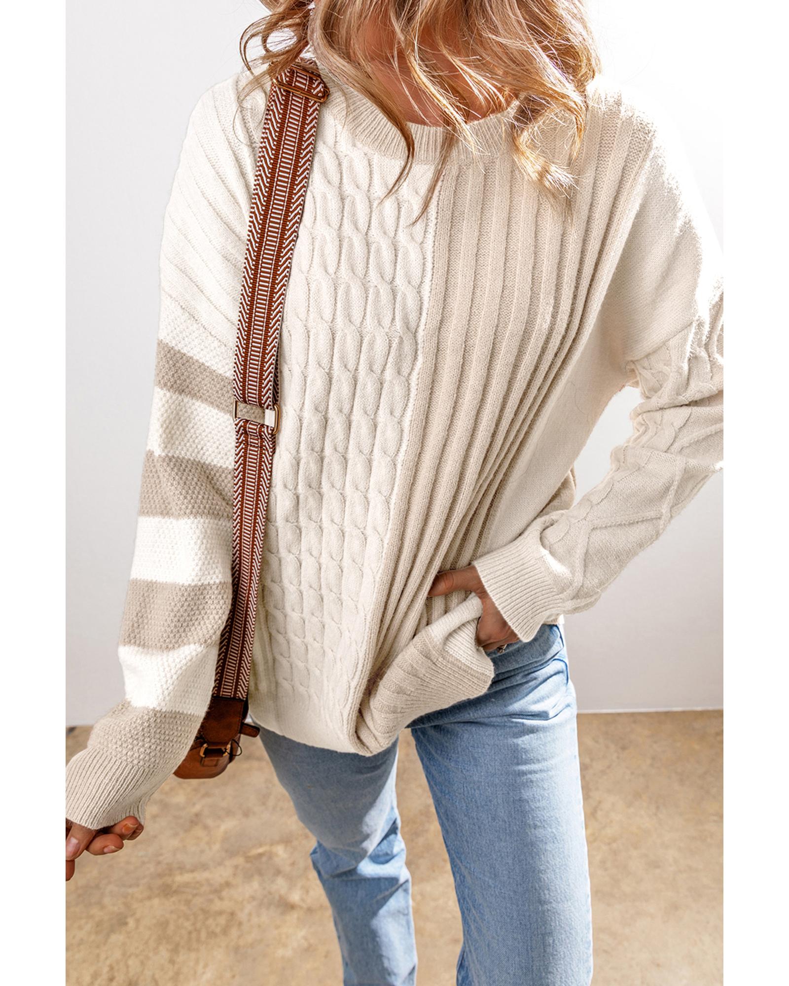 Khaki Cable Knit Colorblock Crew Neck Drop Shoulder Sweater – S